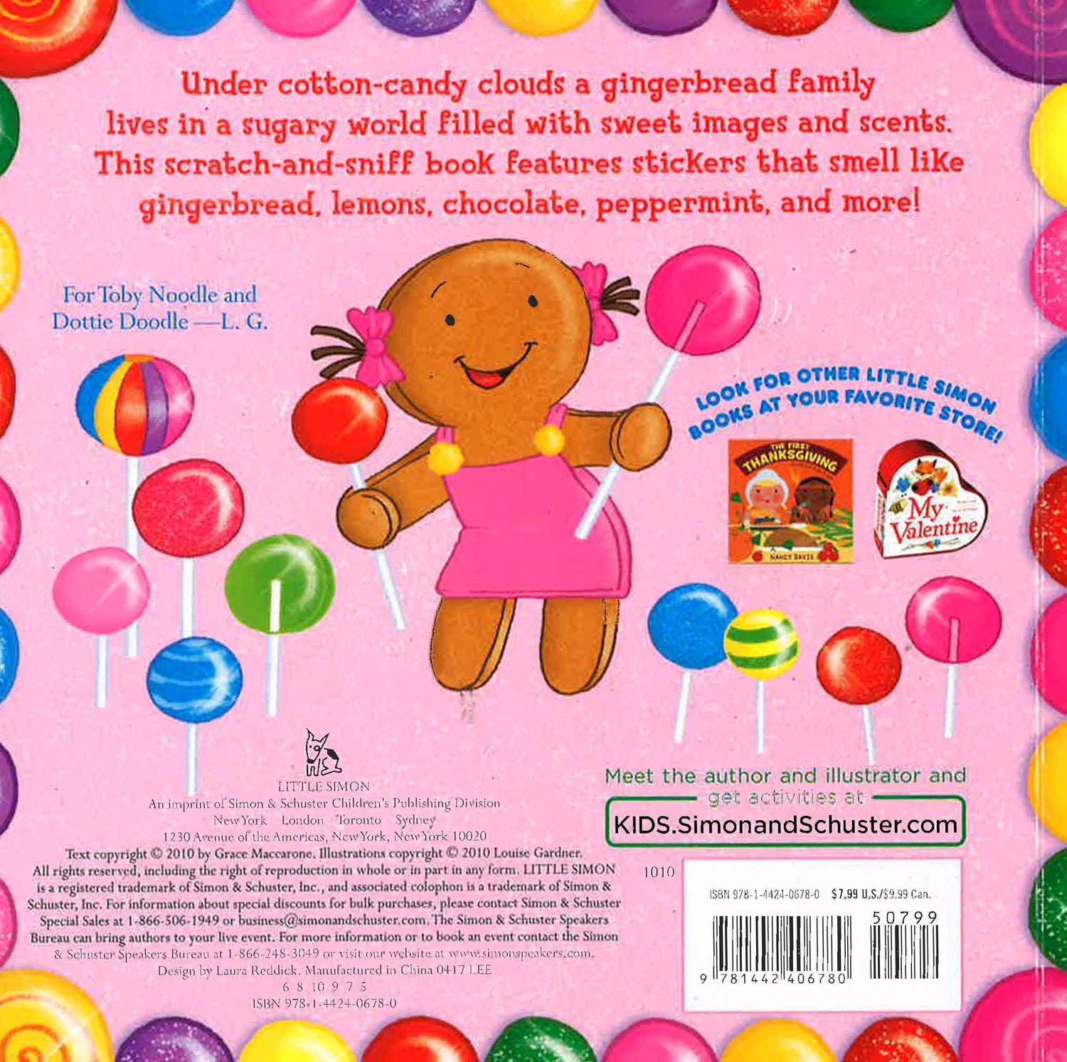 Under cotton candy clouds a gingerbread family lives in a sugary world filled with delectably sweet images and scents. This scratch and sniff book features clear stickers that smell like gingerbread, lemon drops, chocolate, peppermint, and more!