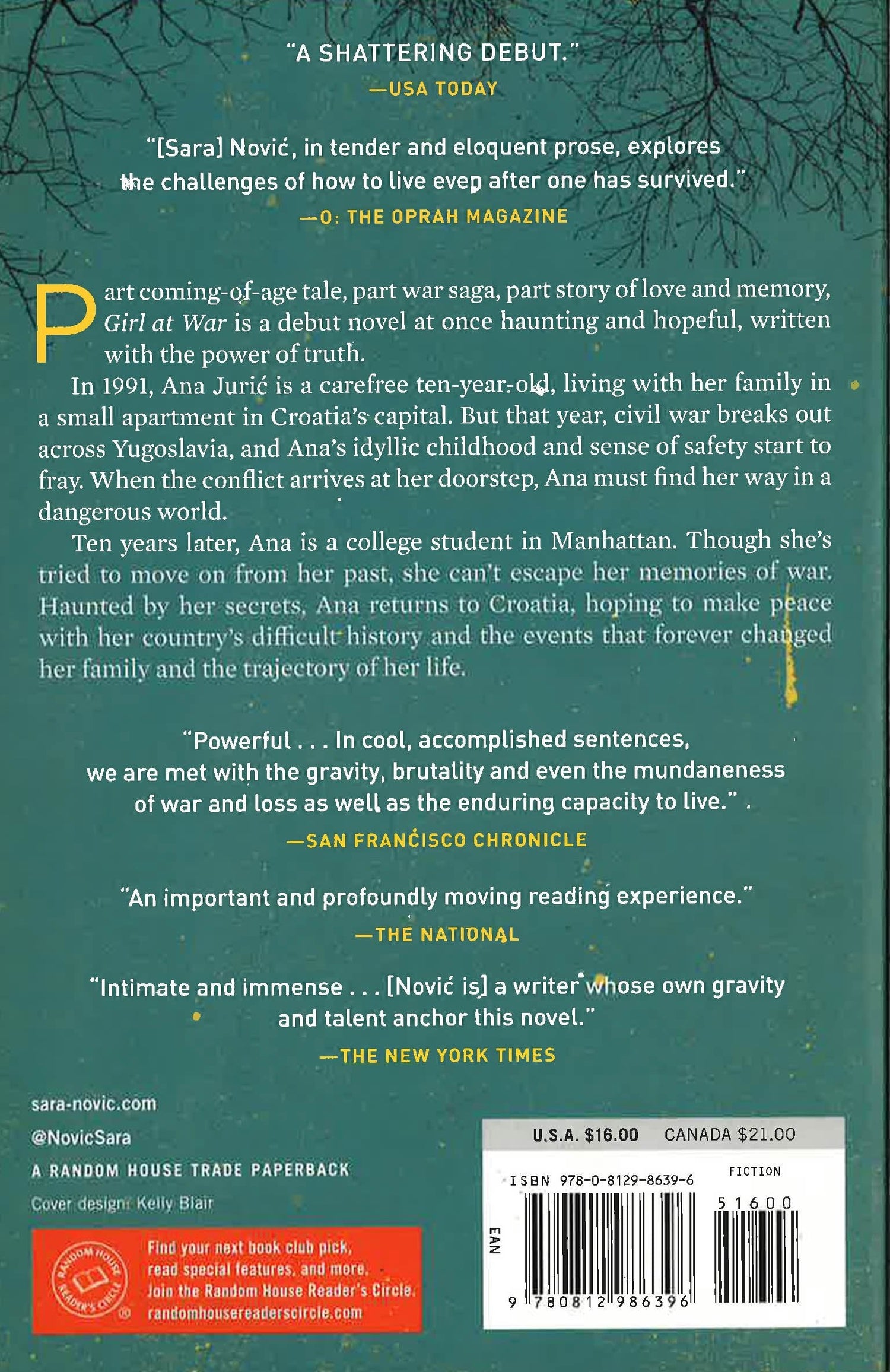 Zagreb, 1991. Ana Juric is a carefree ten-year-old, living with her family in a small apartment in Croatia's capital. But that year, civil war breaks out across Yugoslavia, splintering Ana's idyllic childhood. Daily life is altered by food rations and air raid drills, and soccer matches are replaced by sniper fire. Neighbors grow suspicious of one another, and Ana's sense of safety starts to fray. When the war arrives at her doorstep, Ana must find her way in a dangerous world. New York, 2001. Ana is now a college student in Manhattan. Though she's tried to move on from her past, she can't escape her memories of war--secrets she keeps even from those closest to her. Haunted by the events that forever changed her family, Ana returns to Croatia after a decade away, hoping to make peace with the place she once called home. As she faces her ghosts, she must come to terms with her country's difficult history and the events that interrupted her childhood years before. Moving back and forth through time, Girl at War is an honest, generous, brilliantly written novel that illuminates how history shapes the individual. Sara Novic fearlessly shows the impact of war on one young girl--and its legacy on all of us. It's a debut by a writer who has stared into recent history to find a story that continues to resonate today. Praise for Girl at War