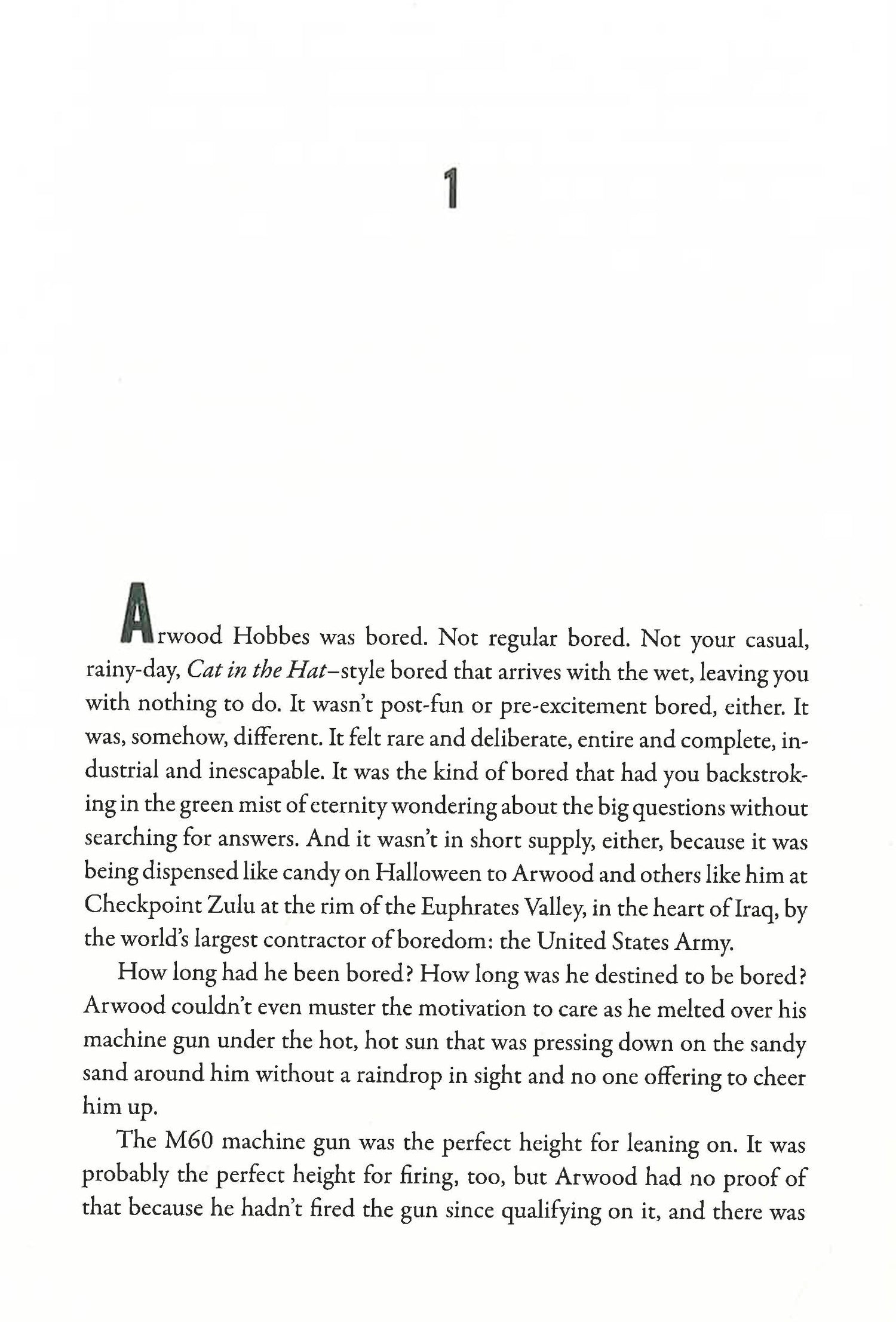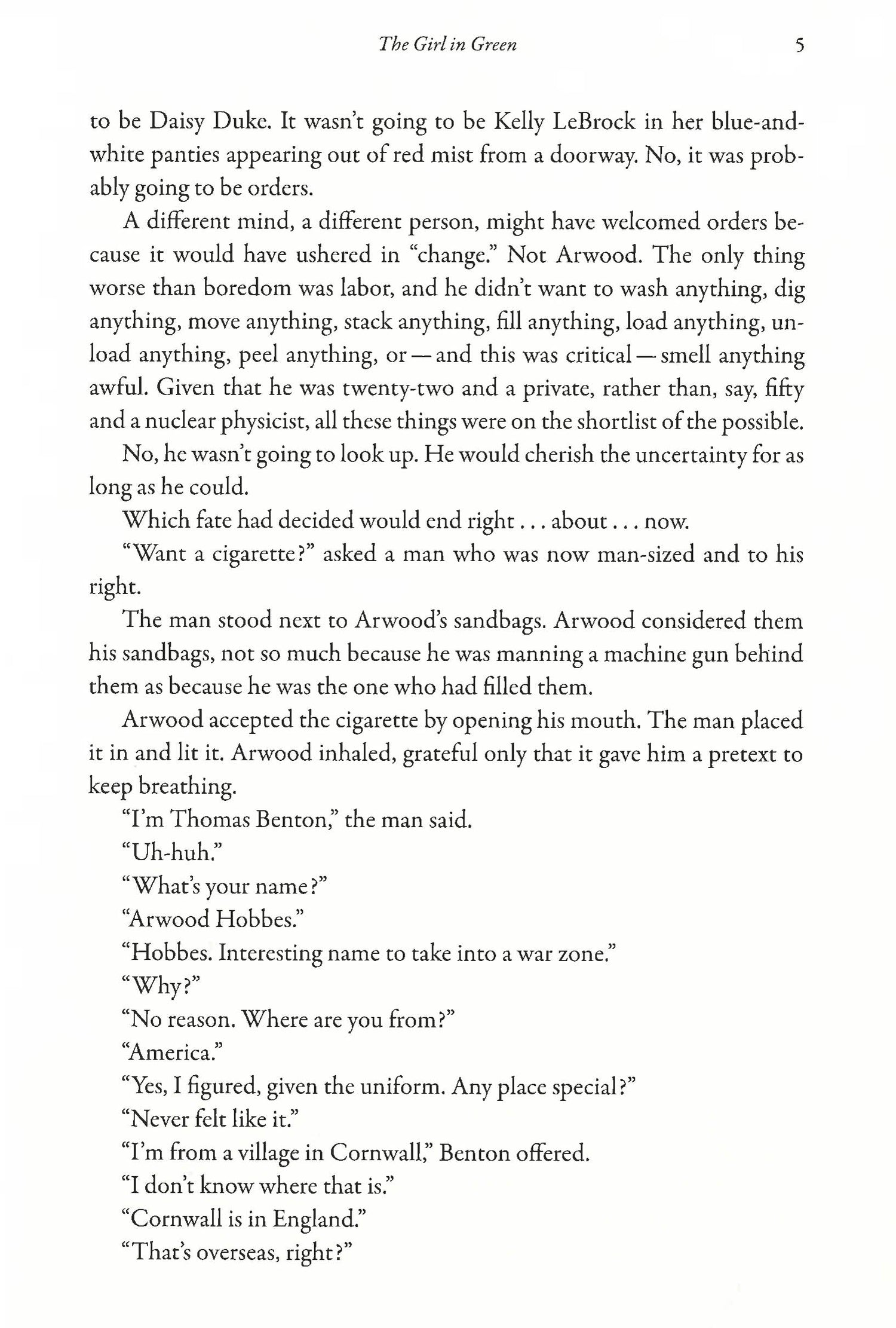 1991. Near Checkpoint Zulu, one hundred miles from the Kuwaiti border, Thomas Benton meets Arwood Hobbes. Benton is a British journalist who reports from war zones in part to avoid his lackluster marriage and a daughter he loves but cannot connect with; Arwood is a midwestern American private who might be an insufferable ignoramus, or might be a genuine lunatic with a death wish--it's hard to tell. Desert Storm is over, peace has been declared, but as they argue about whether it makes sense to cross the nearest border in search of an ice cream, they become embroiled in a horrific attack in which a young local girl in a green dress is killed as they are trying to protect her. The two men walk away into their respective lives. But something has cracked for them both.