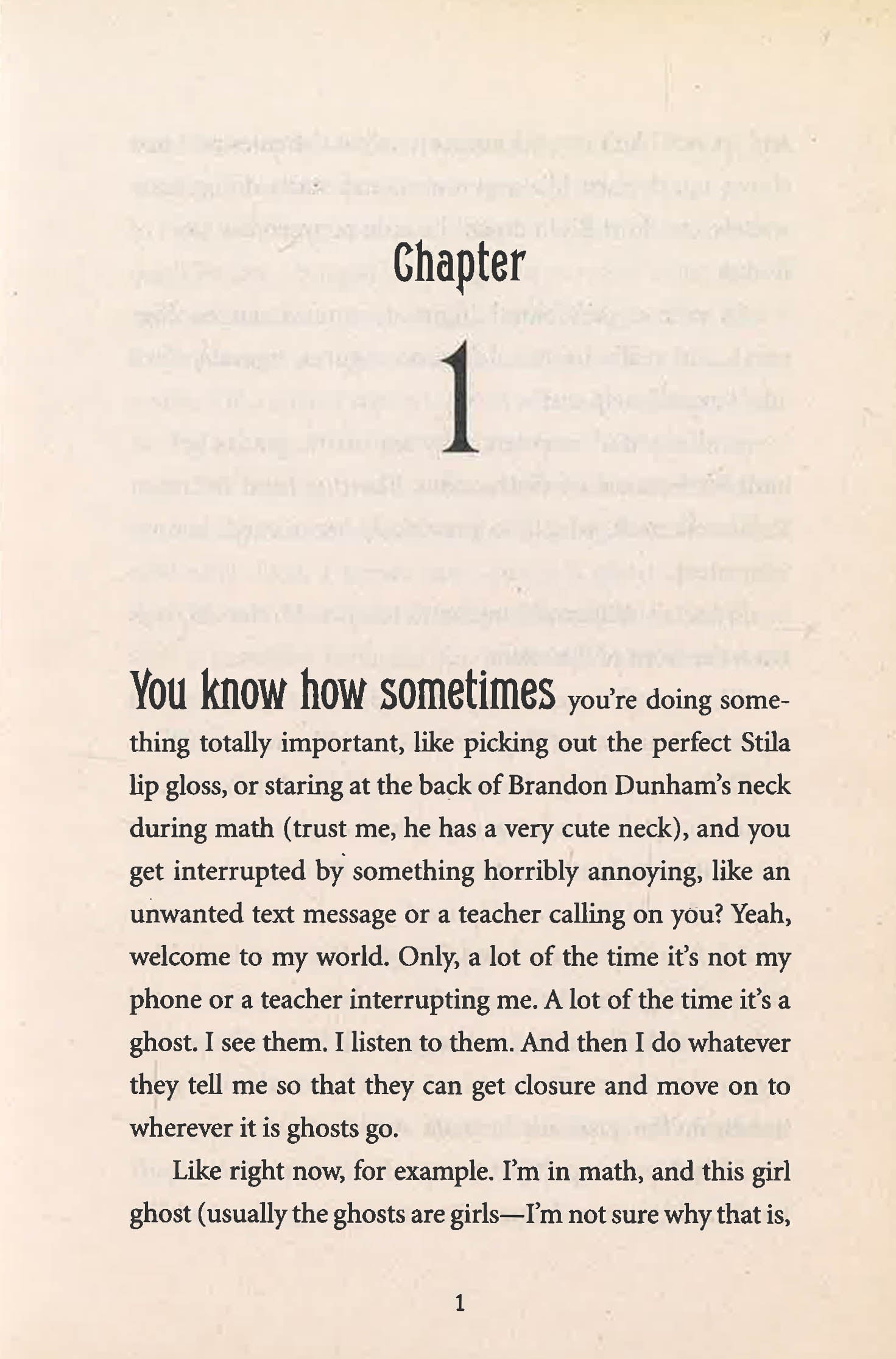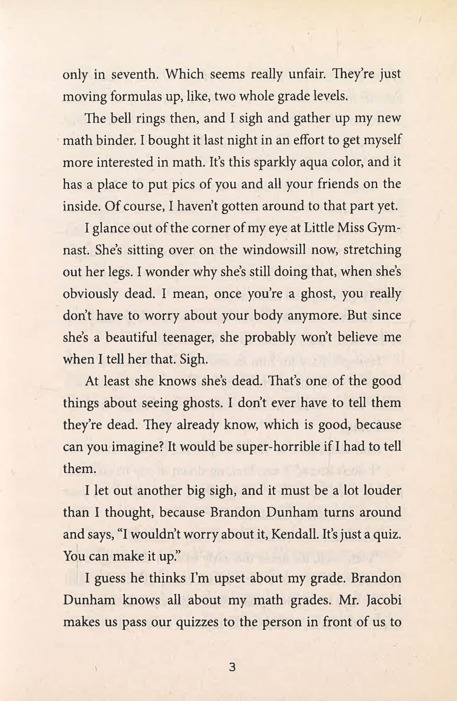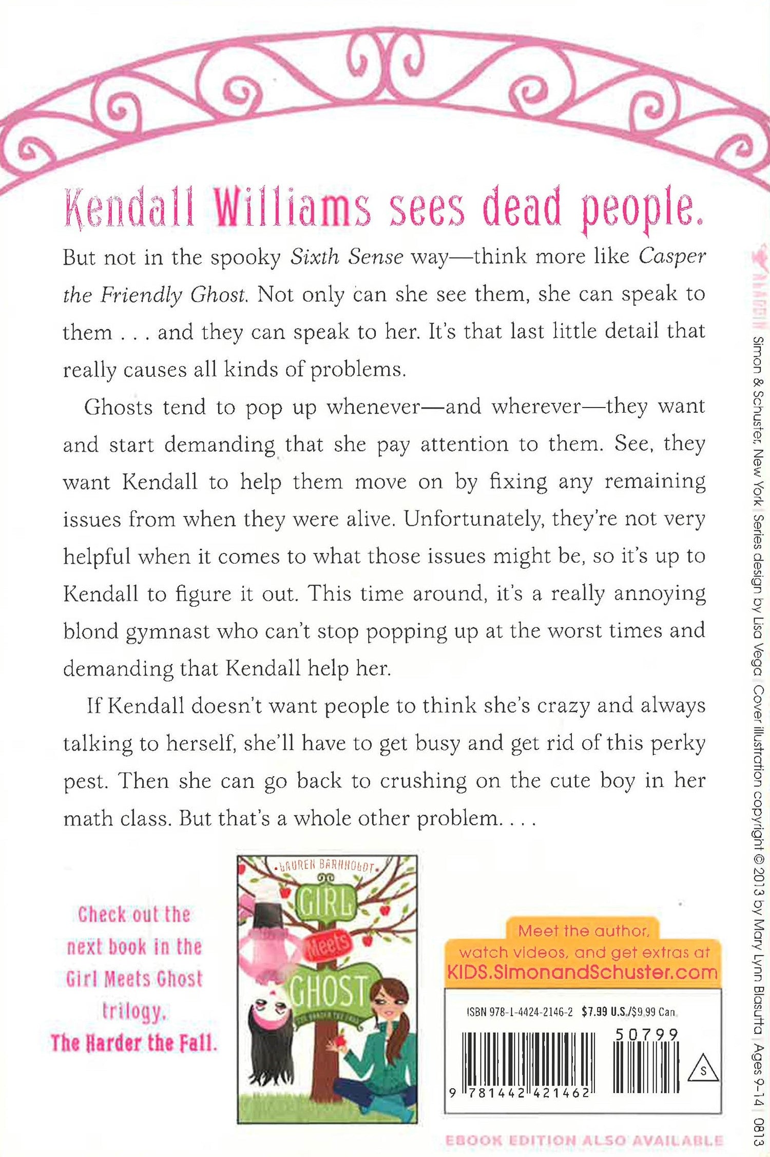 A tween girl becomes a reluctant medium in this start to a hilariously haunting series. Kendall Williams sees dead people. Not only can she see them, she can speak to them...and they can speak to her. It's that last little detail that really causes all kinds of problems. The dead don't have much in the way of boundaries, and they tend to pop up whenever--and wherever--they please. They want Kendall to help them move on by resolving any remaining issues from when they were alive. Unfortunately, they're not too great at explaining what those issues might be, so Kendall has to become a sort of psychic sleuth and figure it out for them. This time around, there's a really annoying blonde gymnast who can't stop popping up at the worst moments and demanding that Kendall help her.