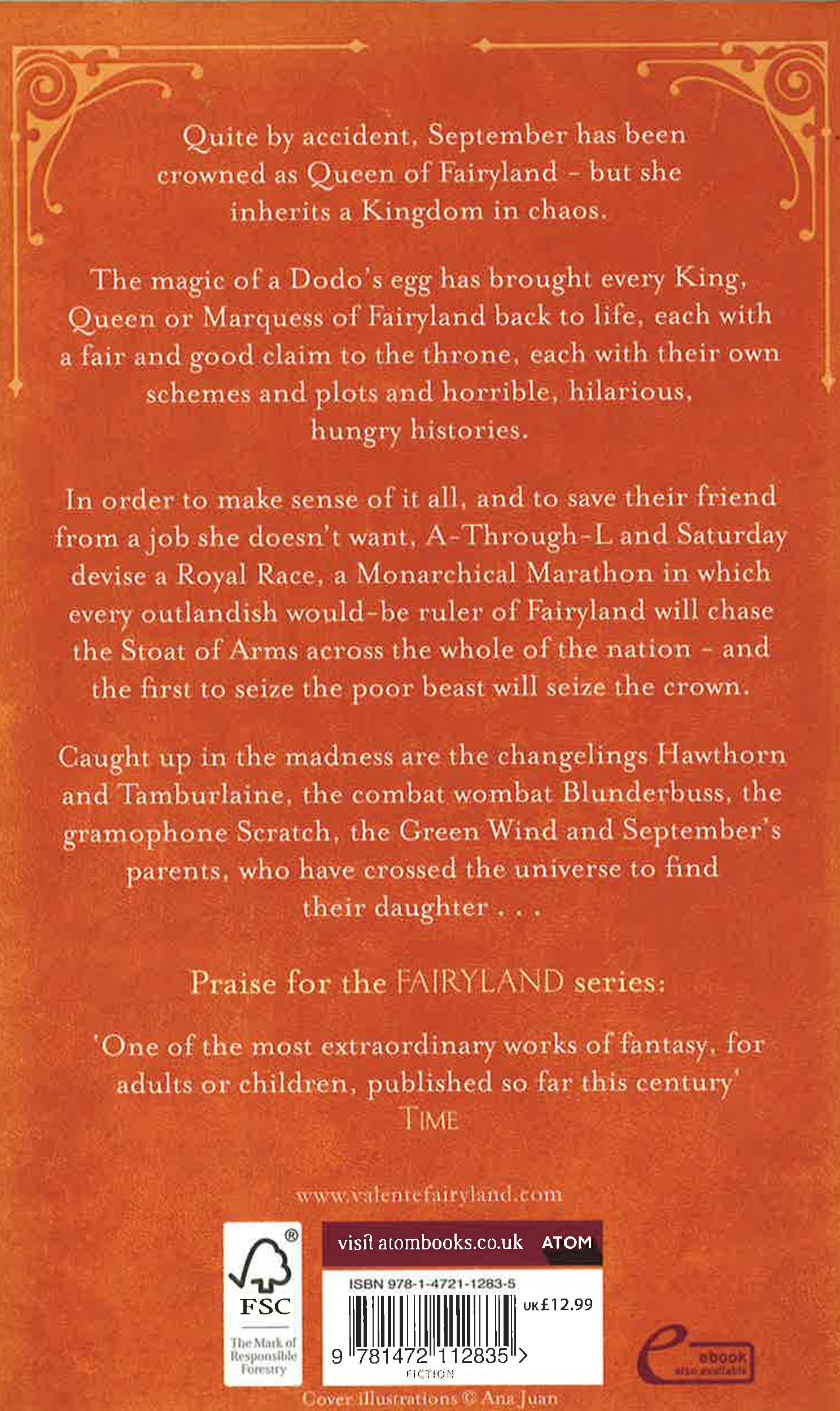 Quite by accident, September has been crowned as Queen of Fairyland - but she inherits a Kingdom in chaos.The magic of a Dodo's egg has brought every King, Queen, or Marquess of Fairyland back to life, each with a fair and good claim on the throne, each with their own schemes and plots and horrible, hilarious, hungry histories. In order to make sense of it all, and to save their friend from a job she doesn't want, A-Through-L and Saturday devise a Royal Race, a Monarckical Marathon, in which every outlandish would-be ruler of Fairyland will chase the Stoat of Arms across the whole of the nation - and the first to seize the poor beast will seize the crown.Caught up in the madness are the changelings Hawthorn and Tamburlaine, the combat wombat Blunderbuss, the gramophone Scratch, the Green Wind, and September's parents, who have crossed the universe to find their daughter...