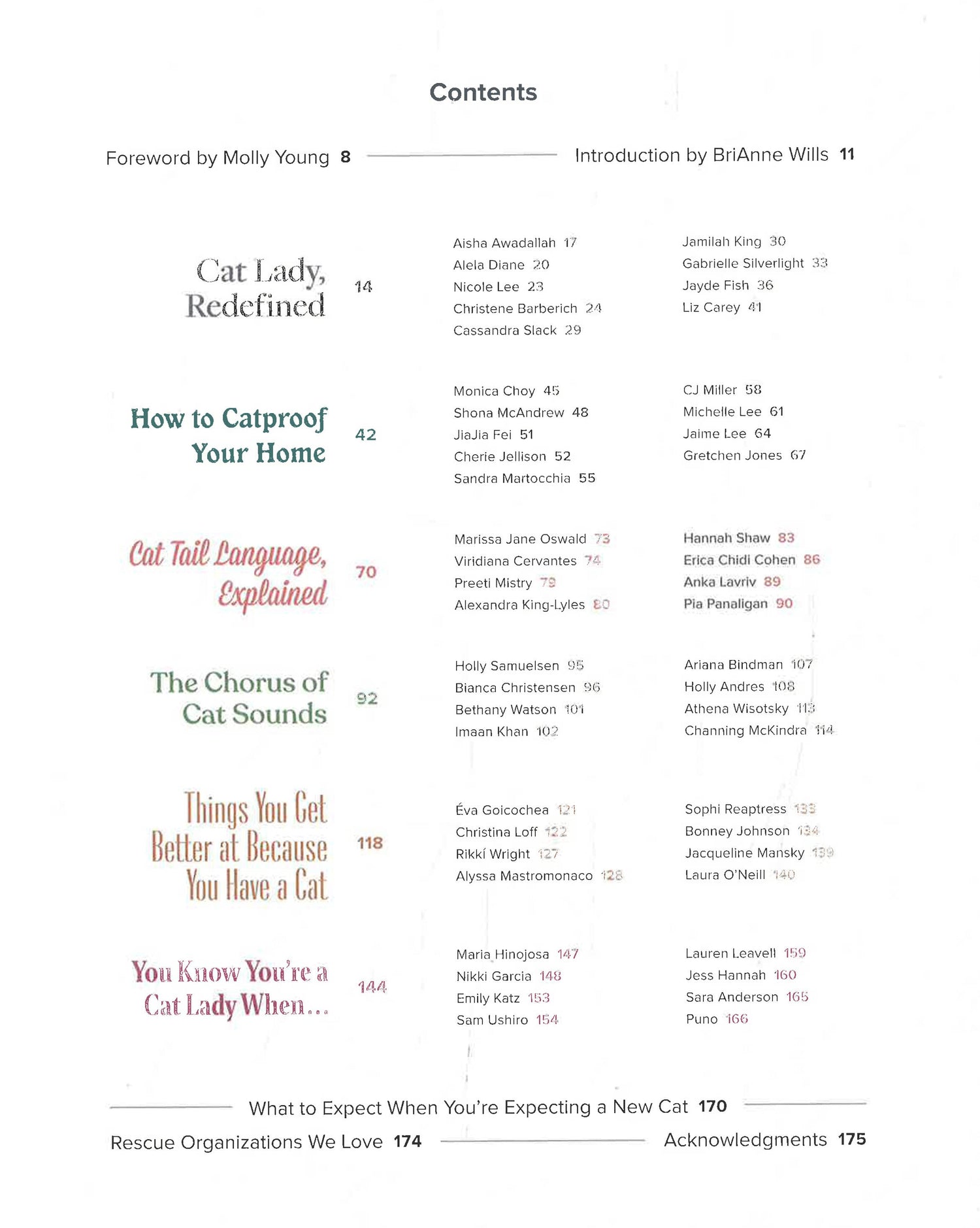 Interspersed throughout are amusing lists any cat lady will find relatable, from "How to Catproof Your Home" to "The Chorus of Cat Sounds," as well as an adoption resource guide and a list of rescue organizations in the United States and Canada.