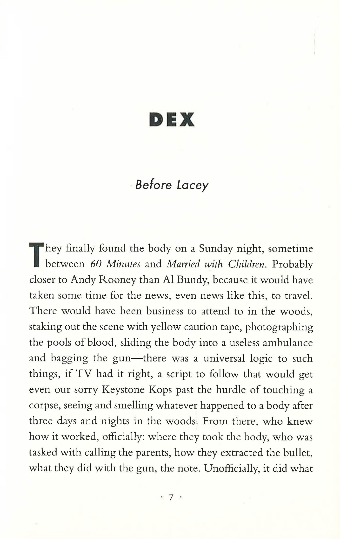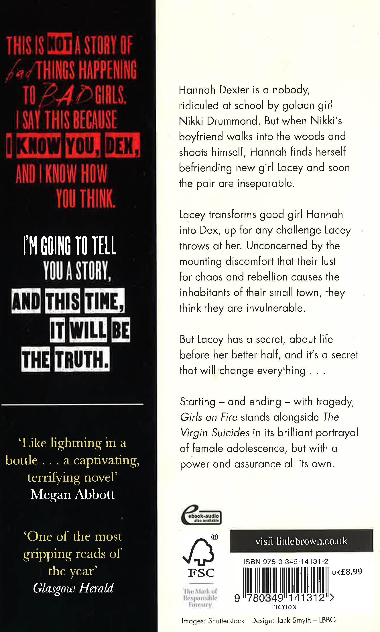 This is not a story of bad things happening to bad girls. I say this because I know you, Dex, and I know how you think. I'm going to tell you a story, and this time, it will be the truth. Hannah Dexter is a nobody, ridiculed and isolated at school by golden girl Nikki Drummond. But in their junior year of high school, Nikki's boyfriend walks into the woods and shoots himself. In the wake of the suicide, Hannah befriends new girl Lacey and soon the pair are inseparable, bonded by their shared hatred of Nikki. Lacey transforms good girl Hannah into Dex who is up for any challenge Lacey throws at her. The two girls bring their combined wills to bear on the community in which they live and think they are invulnerable. But Lacey has a secret, about life before her better half, and it's a secret that will change everything . . .