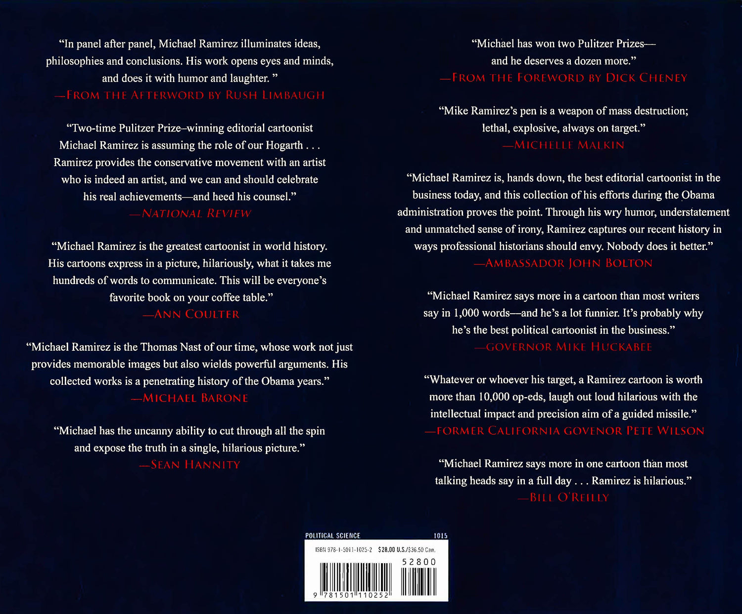 From two-time Pulitzer Prize winning cartoonist Michael Ramirez comes a collection of conservative political cartoons forming a satirical history of the Obama era, with a foreword by Dick Cheney and an afterword by Rush Limbaugh. "Give Me Liberty or Give Me Obamacare" is a trenchant and outright hilarious collection of political cartoons, presenting a wonderfully intelligent and beautifully drawn snapshot of the absurdities of the Obama presidency. Ramirez tackles everything from Obamacare to the economy, foreign policy to culture wars, the environment, and much more. Says Bill O Reilly of this great talent: Michael Ramirez says more in one cartoon than most talking heads say in a full day. With "Give Me Liberty or Give Me Obamacare," he offers the conservative reader a compilation of his award-winning cartoons and a clever way to remember the eight years they ve hated!