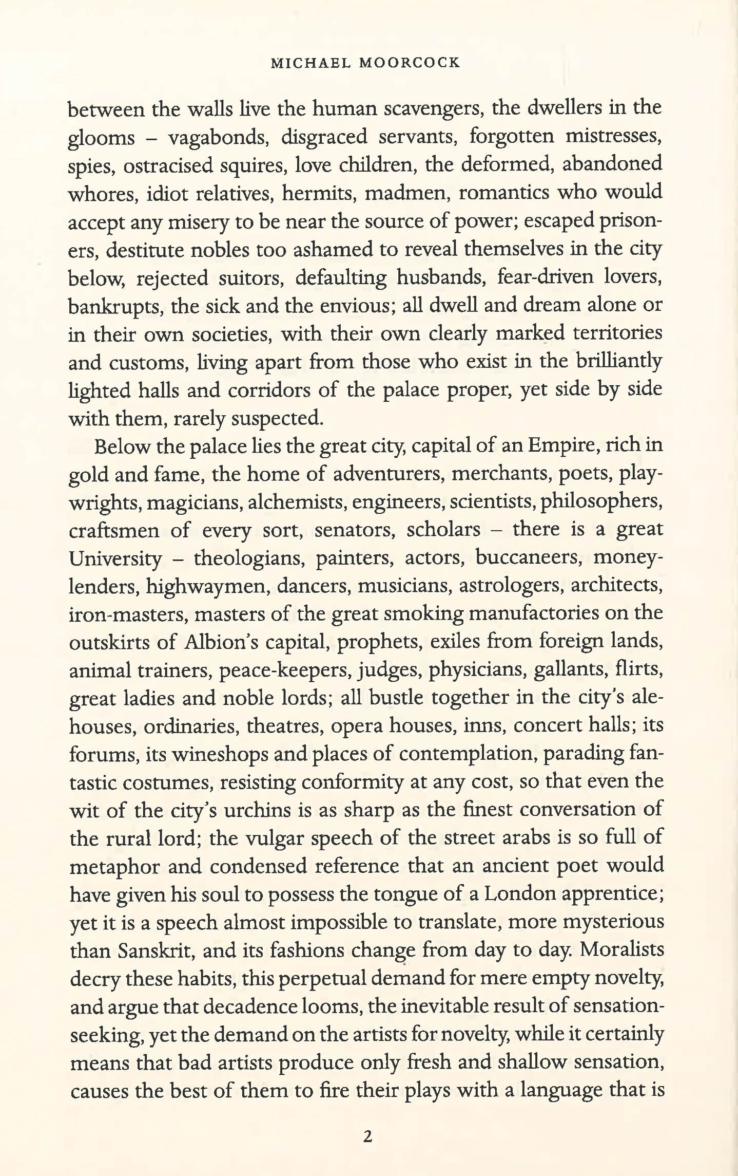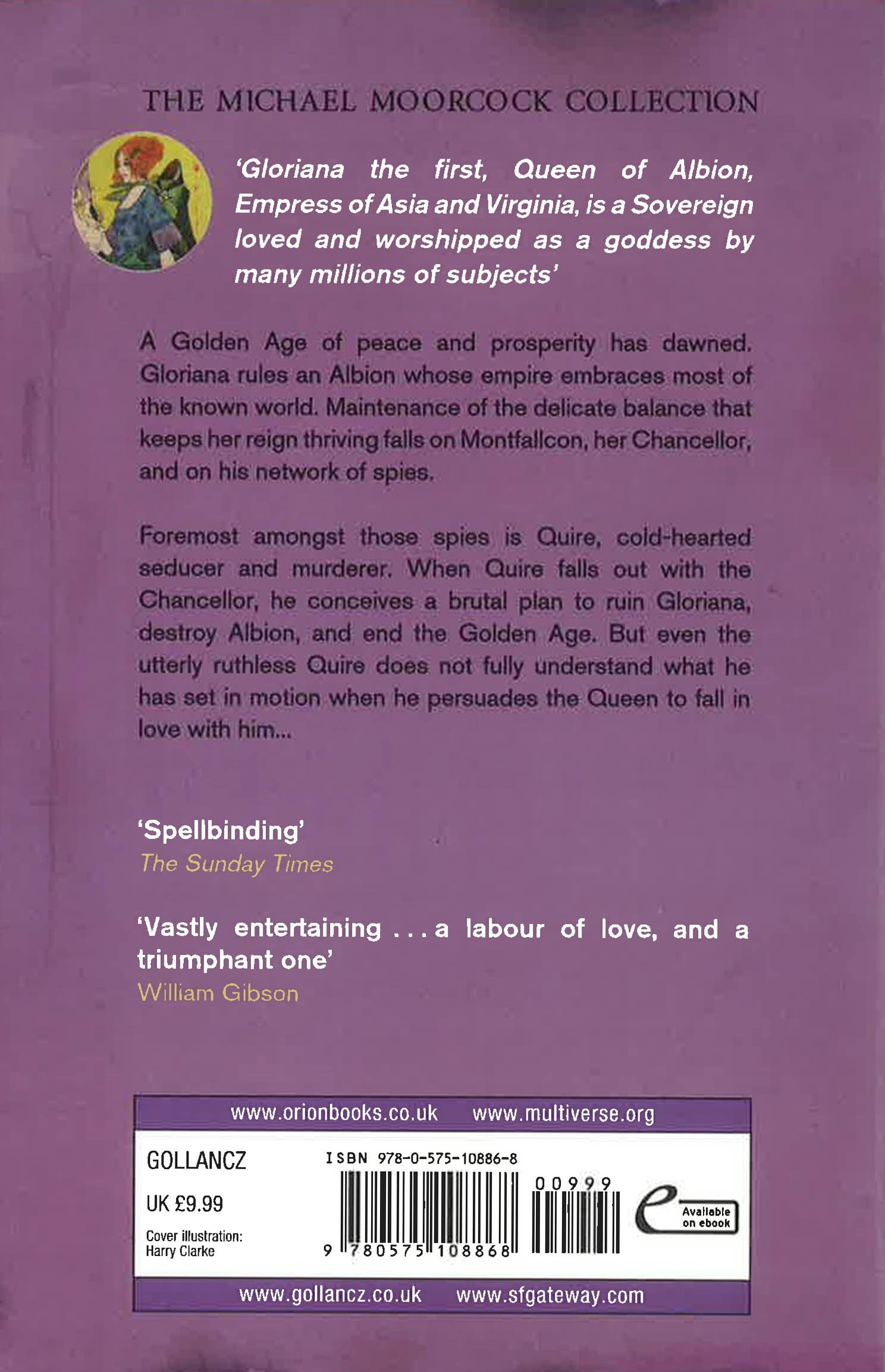 Gloriana rules an Albion whose empire embraces America and most of Asia. A new Golden Age of peace, enlightenment and prosperity has dawned. Gloriana is Albion and Albion is Gloriana; if one falls, so too will the other. And Gloriana is oppressed by the burden this places upon her - and by the fact that she remains incapable of orgasm. The maintenance of the delicate balance that keeps Albion and Gloriana thriving depends on Montfallcon, Gloriana's Chancellor, and on his network of spies and assassins - in particular on Quire, cold hearted seducer of virtue and murderer of innocence. When Quire falls out with Montfallcon, he forms an alliance with his greatest enemy and conceives a plan to ruin Gloriana, destroy Albion, the empire and the Golden Age itself. But even the utterly ruthless Quire does not fully understand what he has set in motion when he persuades the Queen to fall in love with him... Moorcock's masterly evocation of Gloriana's strange and secretive palace and of a vibrant London make this one of his most powerful and memorable novels.