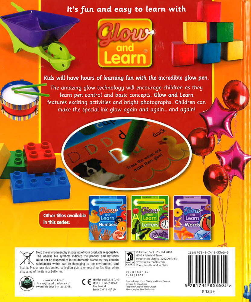 Children will learn pen control and basic concepts by tracing the outlines of the pictures using the incredible glow pen. 4 assorted titles. It's fun and easy to learn with Glow and Learn! Kids will have hours of learning fun as they make the pages glow by tracing the outlines with the incredible glow pen. The amazing glow technology will encourage children as they learn pen control and basic concepts, all while having fun. Featuring exciting activities and bright photographs, children can make the special ink glow again and again... and again! Key Features Amazing glow technology that will encourage children as they learn. A fun way to learn pen control and basic concepts. Featuring exciting activities and bright photographs. Innovative technology that can be used over and over again. Includes a special pen that makes the page glow as you write.