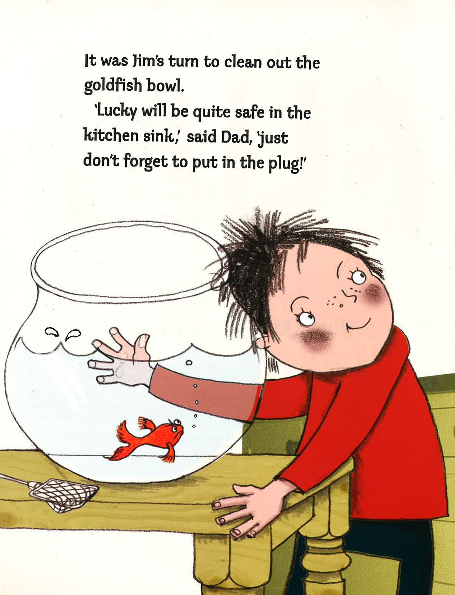 When it's Jim's turn to clean out the goldfish bowl Lucky the goldfish isn't happy. Dad puts Lucky into the sink and tells Jim not to pull the plug out. Everything would be fine if only everyone remembered that!