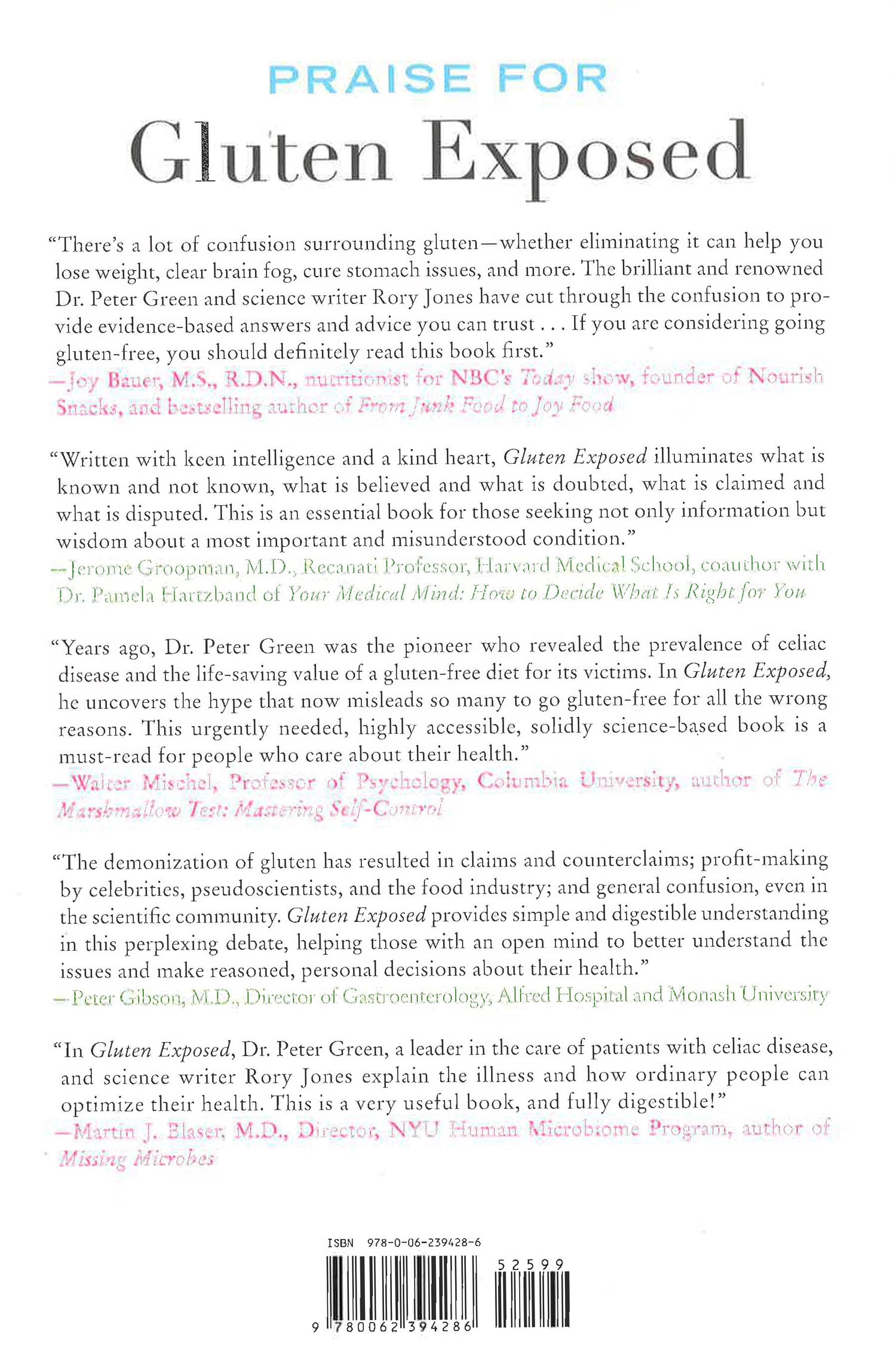 In this essential book on gluten, Dr. Peter H. R. Green, internationally renowned expert on celiac disease and director of the Celiac Disease Center at Columbia University, and acclaimed medical writer Rory Jones reveal the real scientific story behind the current gluten-free craze, identifying what is true and what is just pseudoscience.In recent years, gluten has become a villain, getting blamed for anything and everything from heart disease and dementia to neuralgia and fatigue. Droves of people are adopting a gluten-free lifestyle, believing it’s healthier or that it will help them lose weight and increase their energy. The diet, a regimen once followed only by those diagnosed with celiac disease (a serious autoimmune disorder caused by gluten), has become a cure-all, “prescribed” not only by gastroenterologists but also by dietitians, nutritionists, naturopaths, trainers, psychiatrists, and neurologists, as well as by celebrities and media personalities. Yet as Gluten Exposed reveals, there is little scientific evidence to justify this trend. The latest medical findings have shown that the majority of the information available about the effects of gluten on the body is only partly correct, or almost wholly incorrect.Green and Jones, authors of Celiac Disease: A Hidden Epidemic, cut through the misinformation, false claims, and widespread confusion over gluten. They examine the connections between the gut, brain, and what you ingest (not just gluten, but other food and drugs) to reveal what’s really going on in your body and your brain. They also bring to light the potential dangers of going gluten-free. While the diet is a lifesaver for those with celiac disease, for others it may injure health, rob the body of essential nutrients, and mask real problems. In fact, one of the biggest risks of going on a gluten-free diet without properly testing for what is causing your symptoms is postponing or missing a potentially serious diagnosis.Gluten Exposed provides an in-depth examination of every symptom and condition associated with gluten, how gluten works in the body, what a gluten-free diet cures - and what it doesn’t - and which drugs, supplements, and foods can cause problems often blamed on gluten alone. It offers clear, welcome guidance and a practical road map that can help anyone achieve a healthier, symptom-free life.
