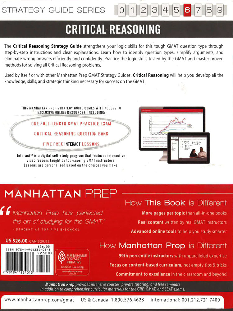 Adapting to the ever-changing GMAT exam, Manhattan Prep's 6th Edition GMAT Strategy Guides offer the latest approaches for students looking to score in the top percentiles. Written by active instructors with 99th-percentile scores, these books are designed with the student in mind. Adapting to the ever-changing GMAT exam, Manhattan Prep's 6th Edition GMAT Strategy Guides offer the latest approaches for students looking to score in the top percentiles. Written by active instructors with 99th-percentile scores, these books are designed with the student in mind. The GMAT Critical Reasoning strategy guide demystifies critical reasoning by teaching a clear, consistent, and effective approach to understanding an argument's logic and choosing the best answer to the given question. Unlike other guides that attempt to convey everything in a single tome, the GMAT Critical Reasoning strategy guide is designed to provide deep, focused coverage of one specialized area tested on the GMAT. As a result, students benefit from thorough and comprehensive subject material, clear explanations of fundamental principles, and step-by-step instructions of important techniques. In-action practice problems and detailed answer explanations challenge the student, while topical sets of Official Guide problems provide the opportunity for further growth. Used by itself or with other Manhattan Prep Strategy Guides, the GMAT Critical Reasoning strategy guide will help students develop all the knowledge, skills, and strategic thinking necessary for success on the GMAT. Purchase of this book includes one year of access to Manhattan Prep's Critical Reasoning Question Bank. All of Manhattan Prep's GMAT Strategy Guides are aligned with the GMAC Official Guide, 2016 edition.