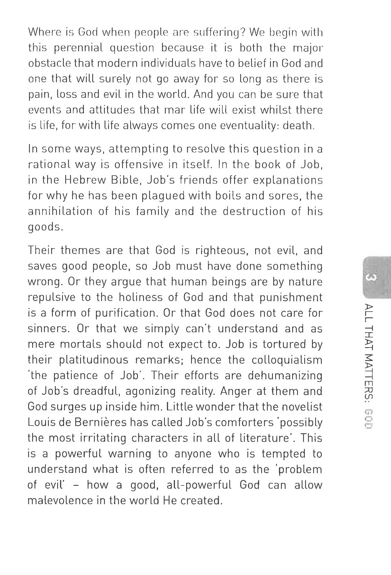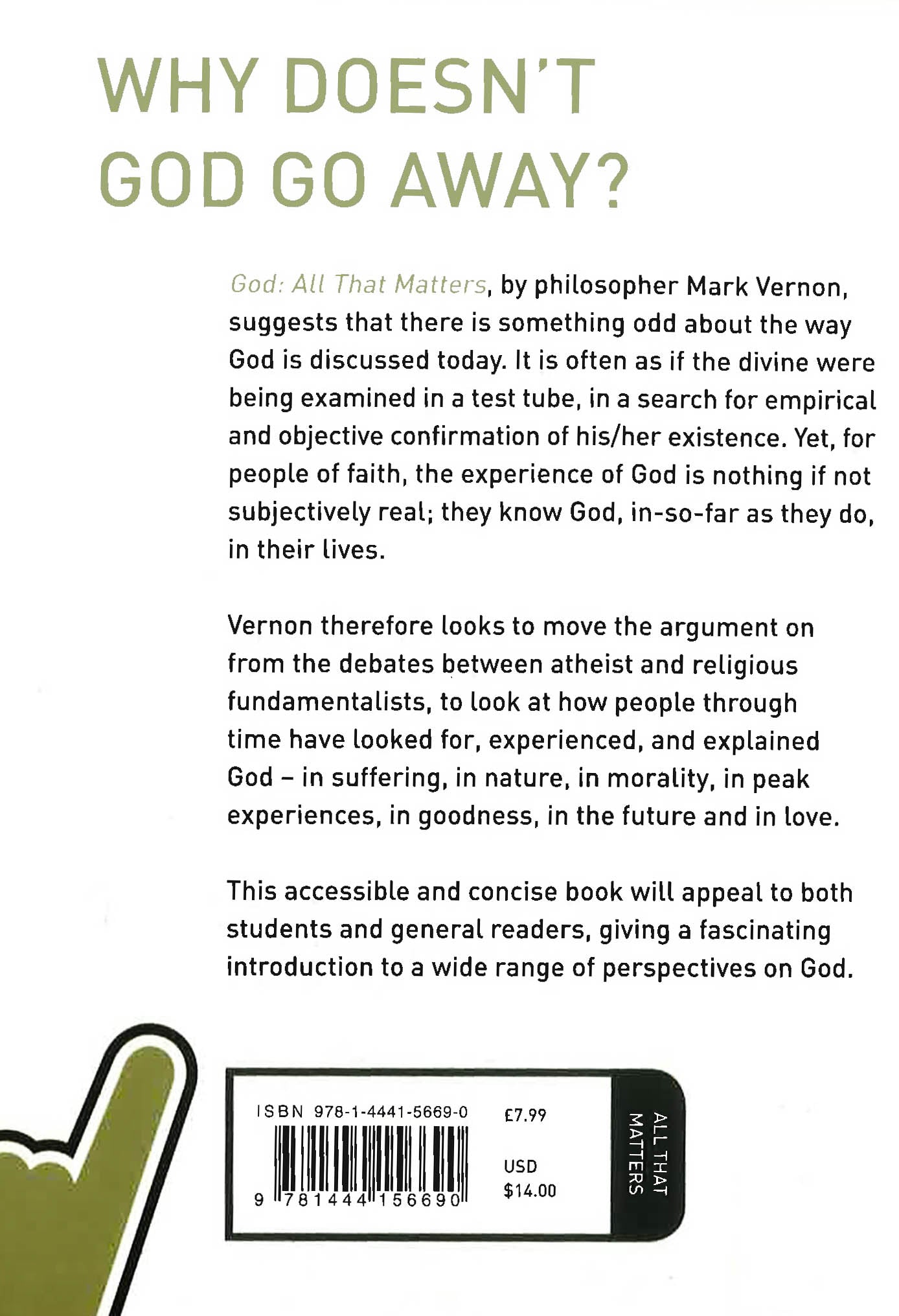 In this book: 'Mark Vernon writes with sharp insight and a generous understanding of how humans search and create meanings to sustain their lives' - Madeleine Bunting, Guardian.Why doesn't God go away? God: All That Matters, by philosopher Mark Vernon,suggests that there is something odd about the way God is discussed today. It is often as if the divine were being examined in a test tube, in a search for empirical and objective confirmation of his/her existence. Yet, for people of faith, the experience of God is nothing if not subjectively real; they know God, in-so-far as they do, in their lives. Vernon therefore looks to move the argument on from the debates between atheist and religious fundamentalists, to look at how people through time have looked for, experienced, and explained God - in suffering, in nature, in morality, in peak experiences, in goodness, in the future and in love.This accessible and concise book will appeal to both students and general readers, giving a fascinating introduction to a wide range of perspectives on God.The All That Matters series:All That Matters books:All books in the All That Matters series are written by world experts in their subject field. These experts work to distil a topic and get right to its heart, making the book accessible for both students and general readers. Each compelling book contains new and interesting perspectives and tells stories that matter.The Author:Mark Vernon has an unparalleled ability to convey profound philosophical ideas in a manner that is both accessible and personal but also rigorous and challenging."- Raymond TallisMark Vernon is a journalist, broadcaster, teacher and author of several books. He is an honorary research fellow at Birkbeck, University of London and has degrees in physics, and theology and a PhD in philosophy. He was a priest in the Church of England, left a convinced atheist, though now takes religious and spiritualpractice very seriously - a journey he has written about in his book How to be an Agnostic. Keep up with Mark Vernon on his website: www.markvernon.com.Other books in the All That Matters series:All That Matters - Interesting introductions to important issuesBooks on the following subjects are available from the All That Matters series: Muhammad, Water, Political Philosophy, Sustainability, Philosophy, Intelligence, Love, Russian Revolution, War, and Creativity.To find out more visit: www.allthatmattersbooks.com