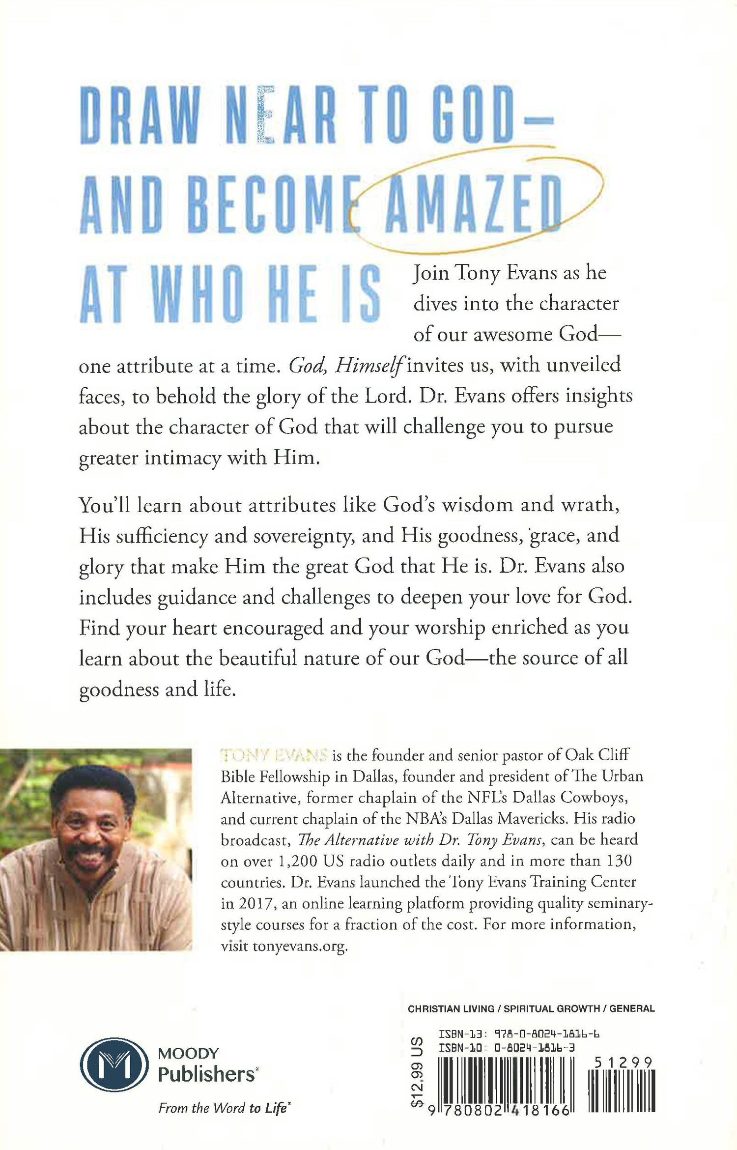 When we draw near and learn more about this God, we become amazed at who He truly is. Join Tony Evans as he dives into the character of our awesome God—one attribute at a time. In God, Himself, we are invited, with unveiled faces, to behold the glory of the Lord—just as the Apostle Paul instructed the Corinthians to do. Dr. Evans offers insights about the character of God that will challenge you to pursue greater intimacy with Him and help you understand more fully what it means to be made in His image. For after all, as image-bearers knowing who He is defines who we are.