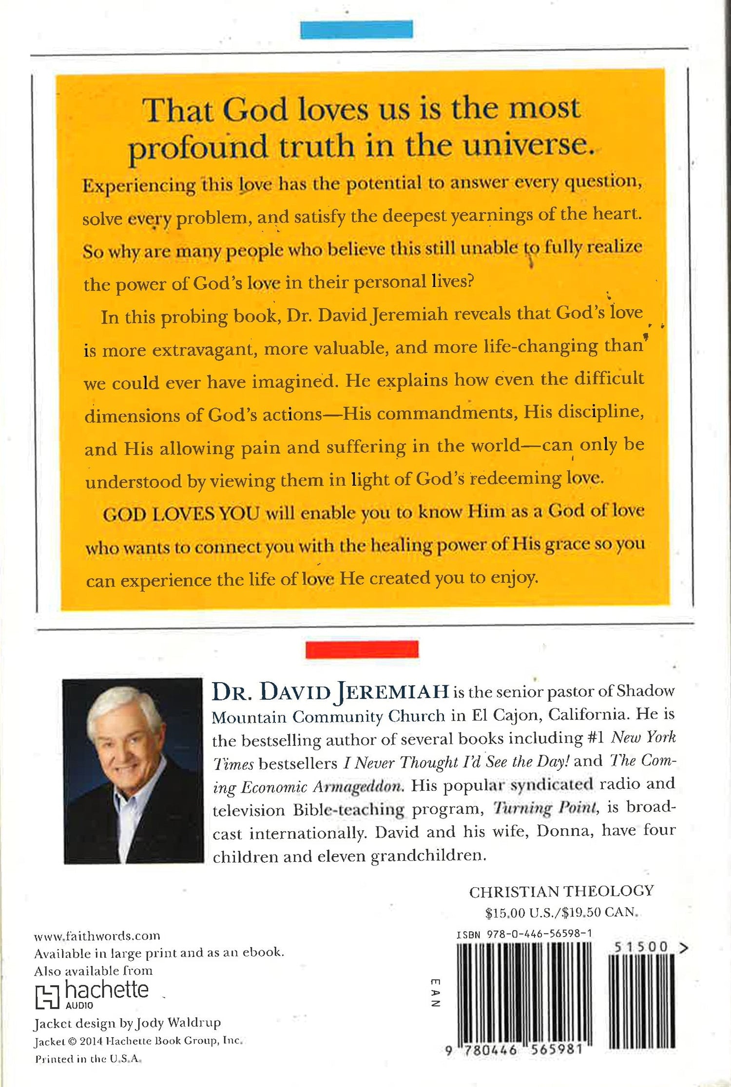 That God loves us is the most profound truth in the universe. Experiencing this love has the potential to answer every question, solve every problem, and satisfy the deepest yearnings of the heart. So why are many people who believe this still unable to fully utilize the power of God's love in their personal lives? In this probing book, Dr. David Jeremiah reveals that not fully understanding and appreciating every critical dimension of God's love can lead to missed opportunities to experience His love. He explains how even the so-called negative dimension of God's actions--hell, prohibitive commandments, pain and suffering in the world--can only be rightly understood by viewing them in light of God's true love. GOD LOVES YOU will enable readers to know God in a way that will consciously connect them with the healing power of His grace so they can experience the life of love they were created to enjoy.