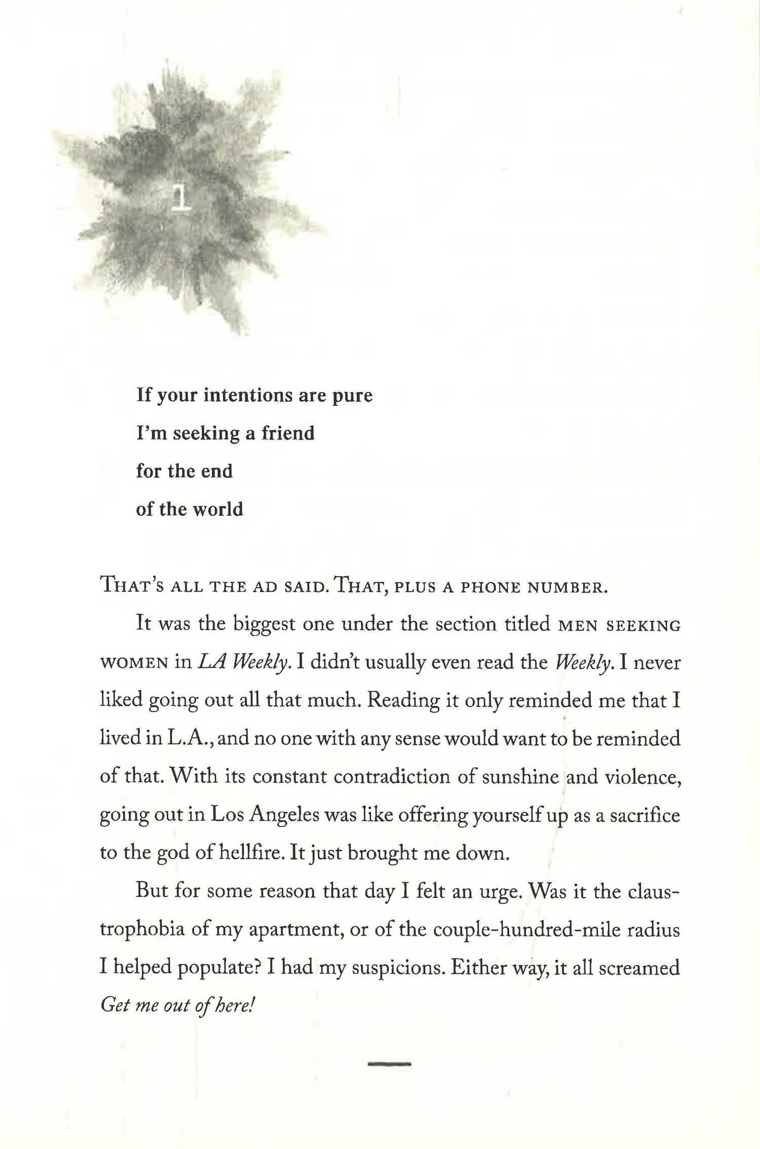 It's a simple personal ad: "I am seeking a friend for the end of the world..." Eleven little words that change Beatrice's life irrevocably. Because they lead her to Jacob Grace, an unpredictable writer looking for something he can't name.