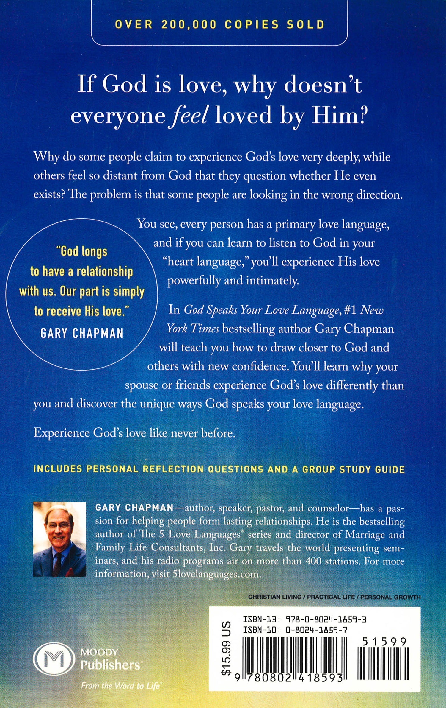 Do you realize that the God of the universe speaks your love language, and your expressions of love for Him are shaped by your love language? Learn how you can give and receive God's love through the five love languages: words of affirmation, quality time, gifts, acts of service, and physical touch. Gary Chapman writes, "As we respond to the love of God and begin to identify the variety of languages He uses to speak to us, we soon learn to speak those languages ourselves. Whatever love language you prefer, may you find ever deeper satisfaction in using that language in your relationship with God and with other people."
