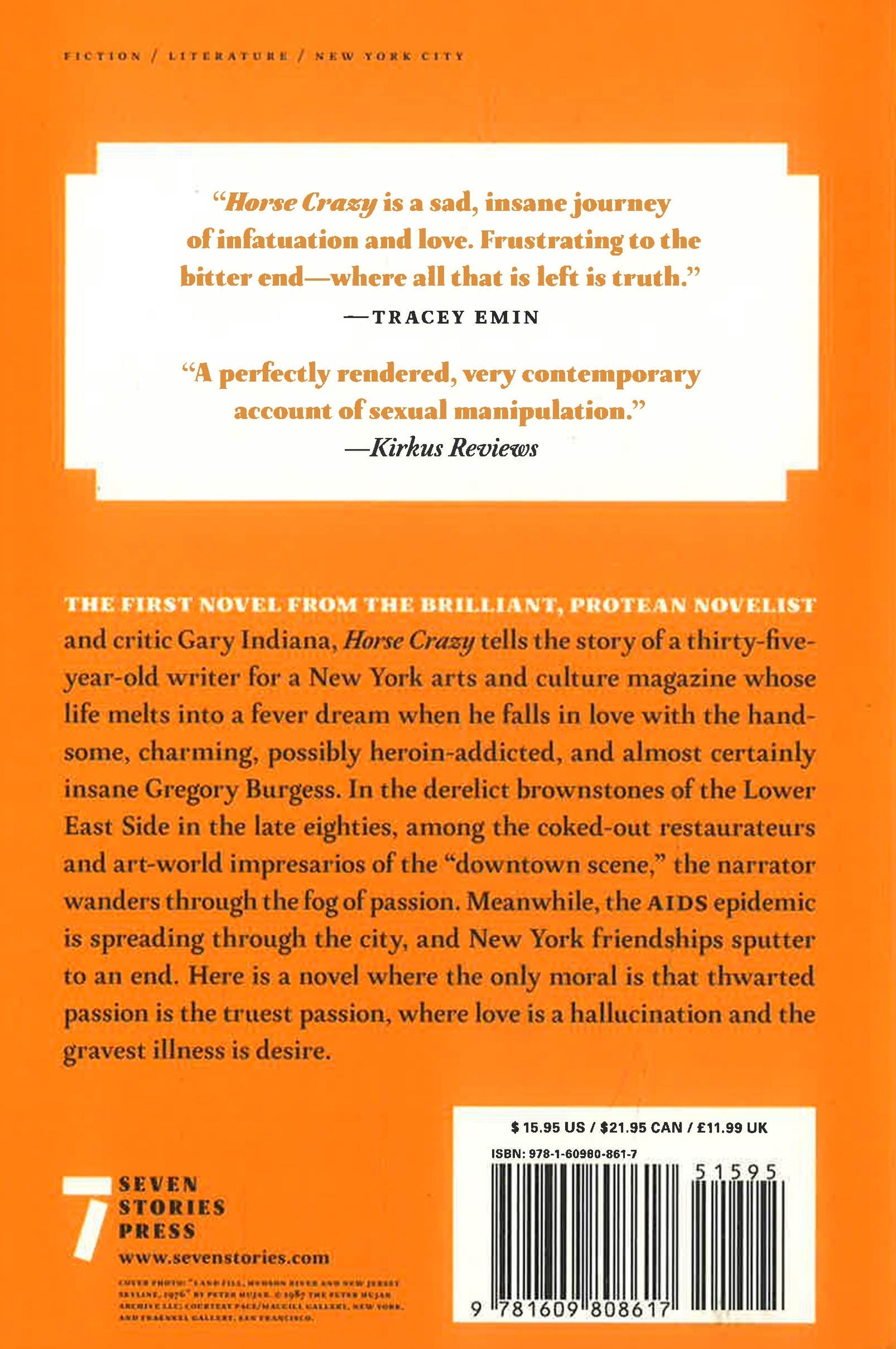 This story, if it is one, deserves the closure of a suicide, perhaps even the magisterial finality of what is usually called a novel, but the remnants of that faraway time offer nothing more than a taste of damp ashes, a feeling of indeterminacy, and the obdurate inconclusiveness of passing time. So writes the unnamed narrator of Horse Crazy, looking back on a season of madness and desire. The first novel from the brilliant, protean Gary Indiana, Horse Crazy tells the story of a thirty-five-year-old writer for a New York arts and culture magazine whose life melts into a fever dream when he falls in love with the handsome, charming, possibly heroin-addicted, and almost certainly insane Gregory Burgess. In the derelict brownstones of the Lower East Side in the late eighties, among the coked out restauranteurs and art world impresarios of the supposed downtown scene, the narrator wanders through the fog of passion. Meanwhile, the AIDS epidemic is spreading through the city, and New York friendships sputter to an end. Here is a novel where the only moral is that thwarted passion is the truest passion, where love is a hallucination and the gravest illness is desire.