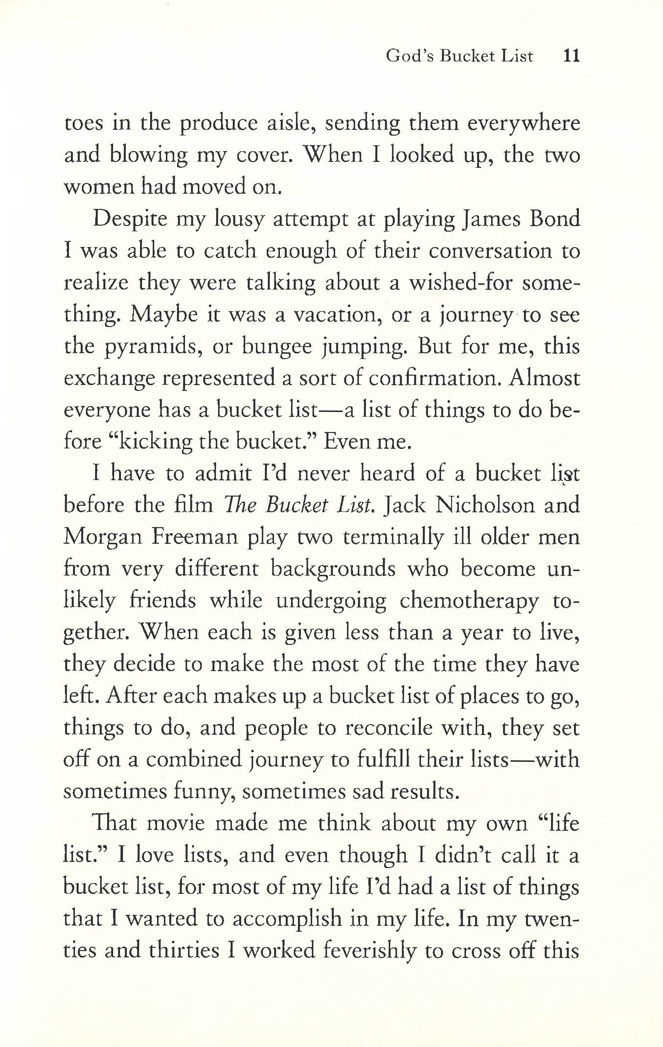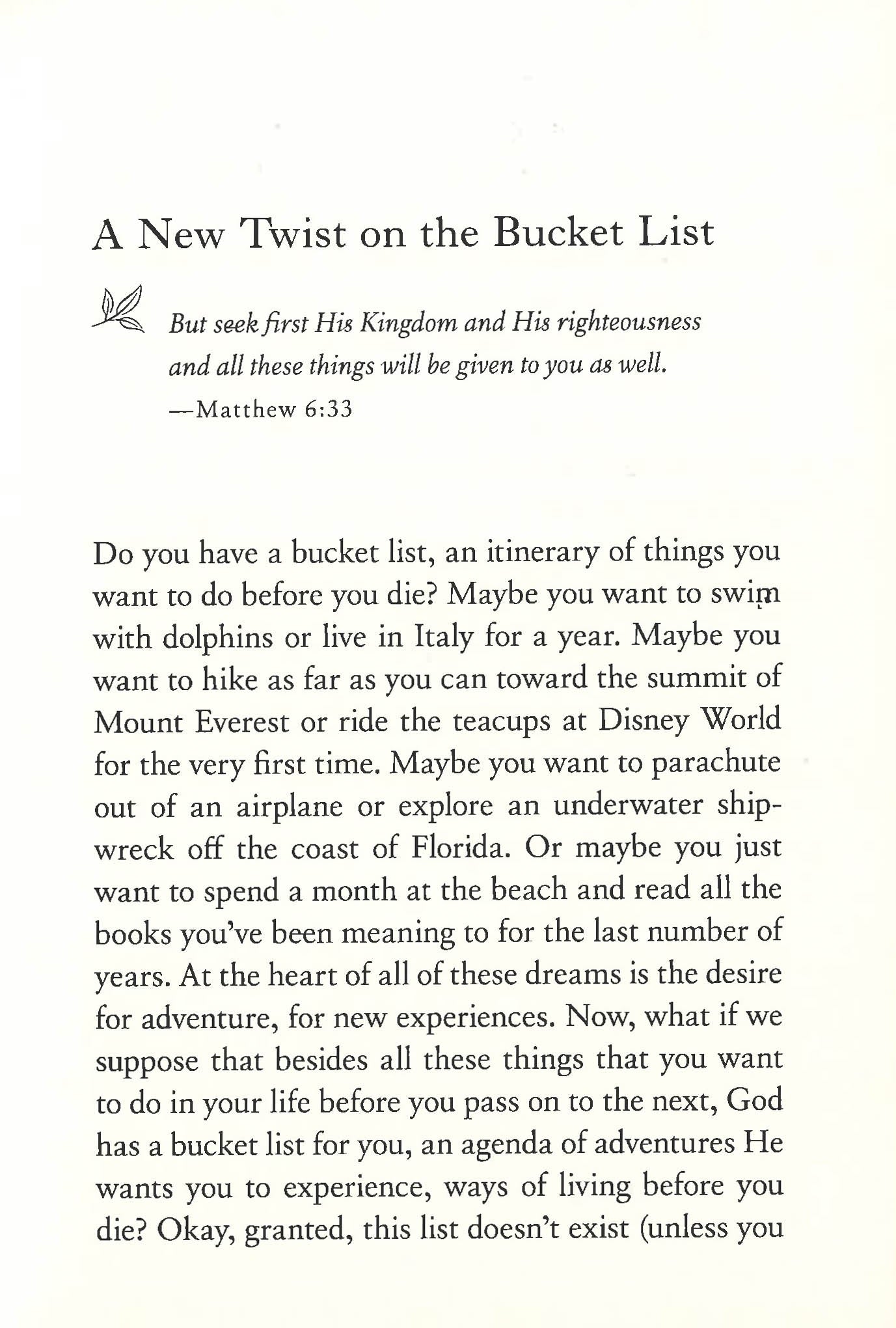 Scripture tells us only God knows the desires of our hearts. It was, after all, God who placed them there because they are designed to lead us to His will for our lives. Why, then, is it so challenging at times to figure out if we are on the right track when it comes to what we believe we want or need? God's Bucket List will examine what God wants for each of us: mercy, fruitfulness, fellowship, and peace, just to name a few, and will explain what the Christian faith teaches about these gifts and how we can begin to achieve and cross out, one by one, the items on that heavenly list.