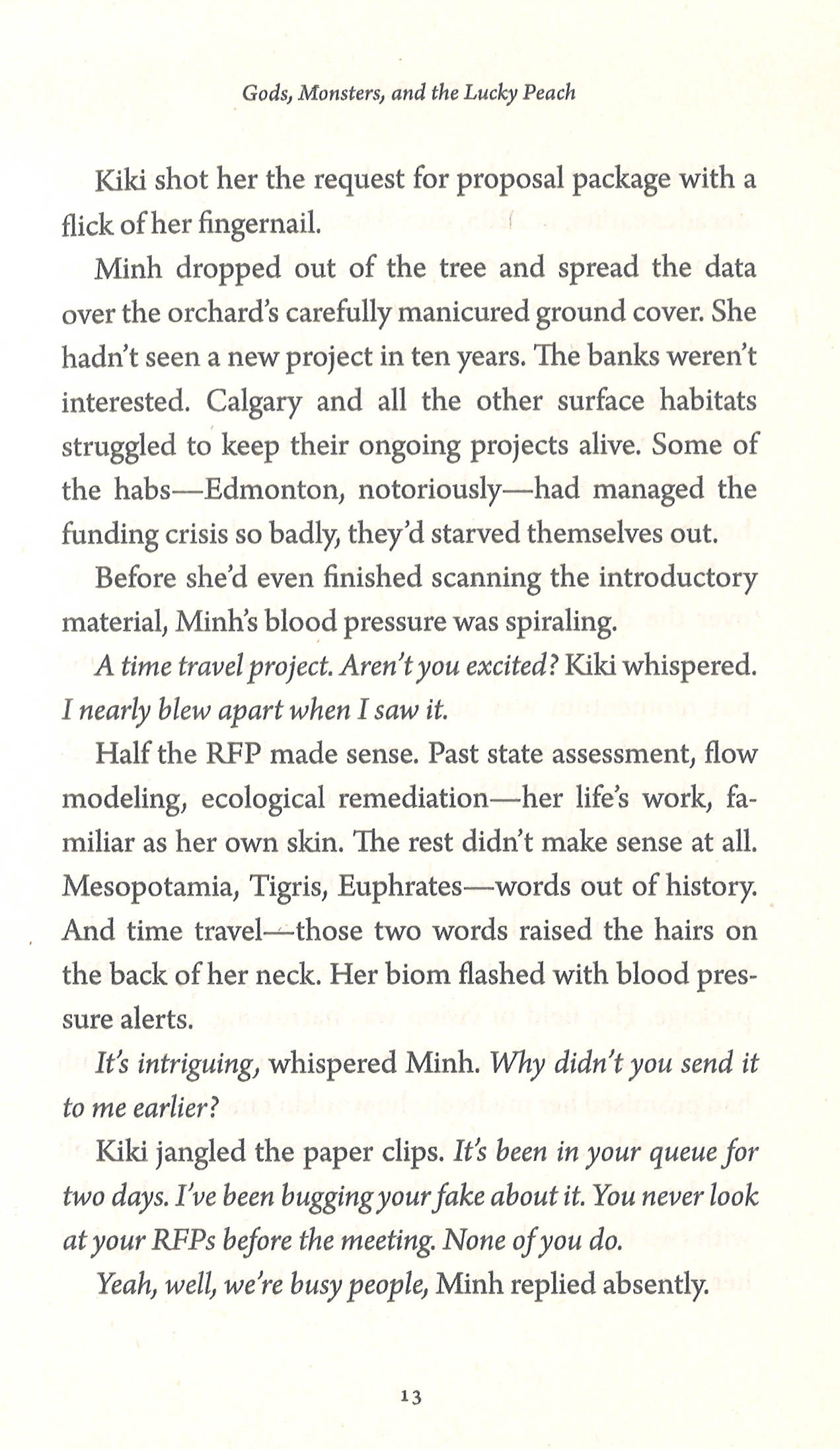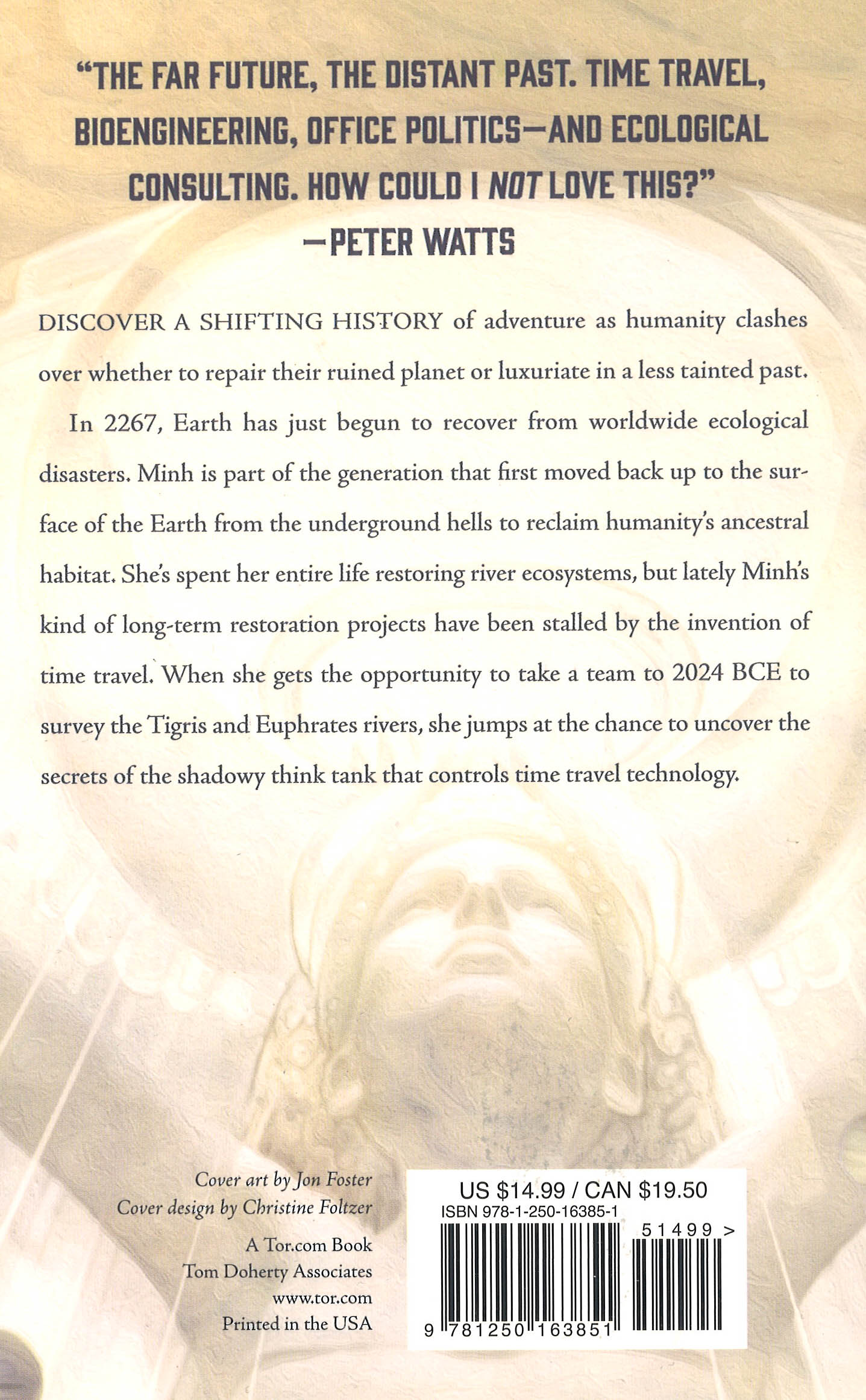 In 2267, Earth has just begun to recover from worldwide ecological disasters. Minh is part of the generation that first moved back up to the surface of the Earth from the underground hells, to reclaim humanity's ancestral habitat. She's spent her entire life restoring river ecosystems, but lately the kind of long-term restoration projects Minh works on have been stalled due to the invention of time travel. When she gets the opportunity take a team to 2000 BC to survey the Tigris and Euphrates rivers, she jumps at the chance to uncover the secrets of the shadowy think tank that controls time travel technology.