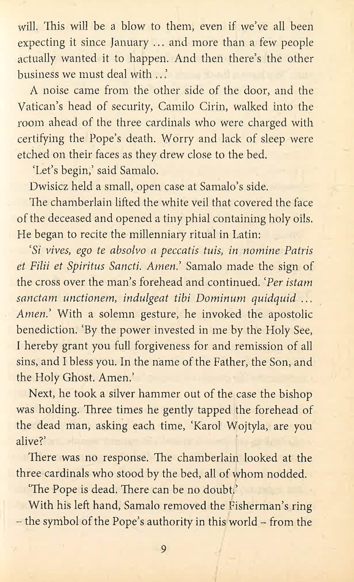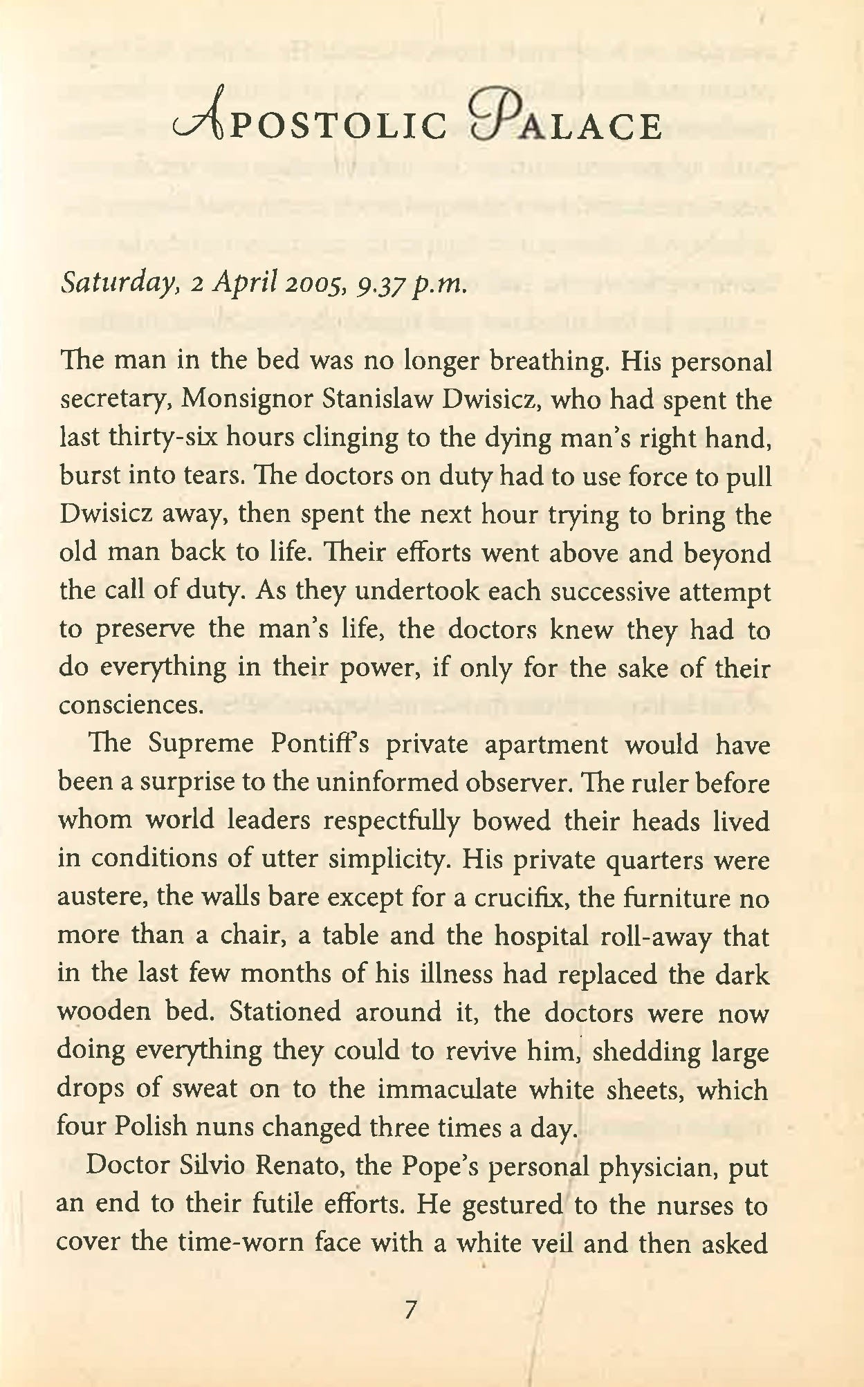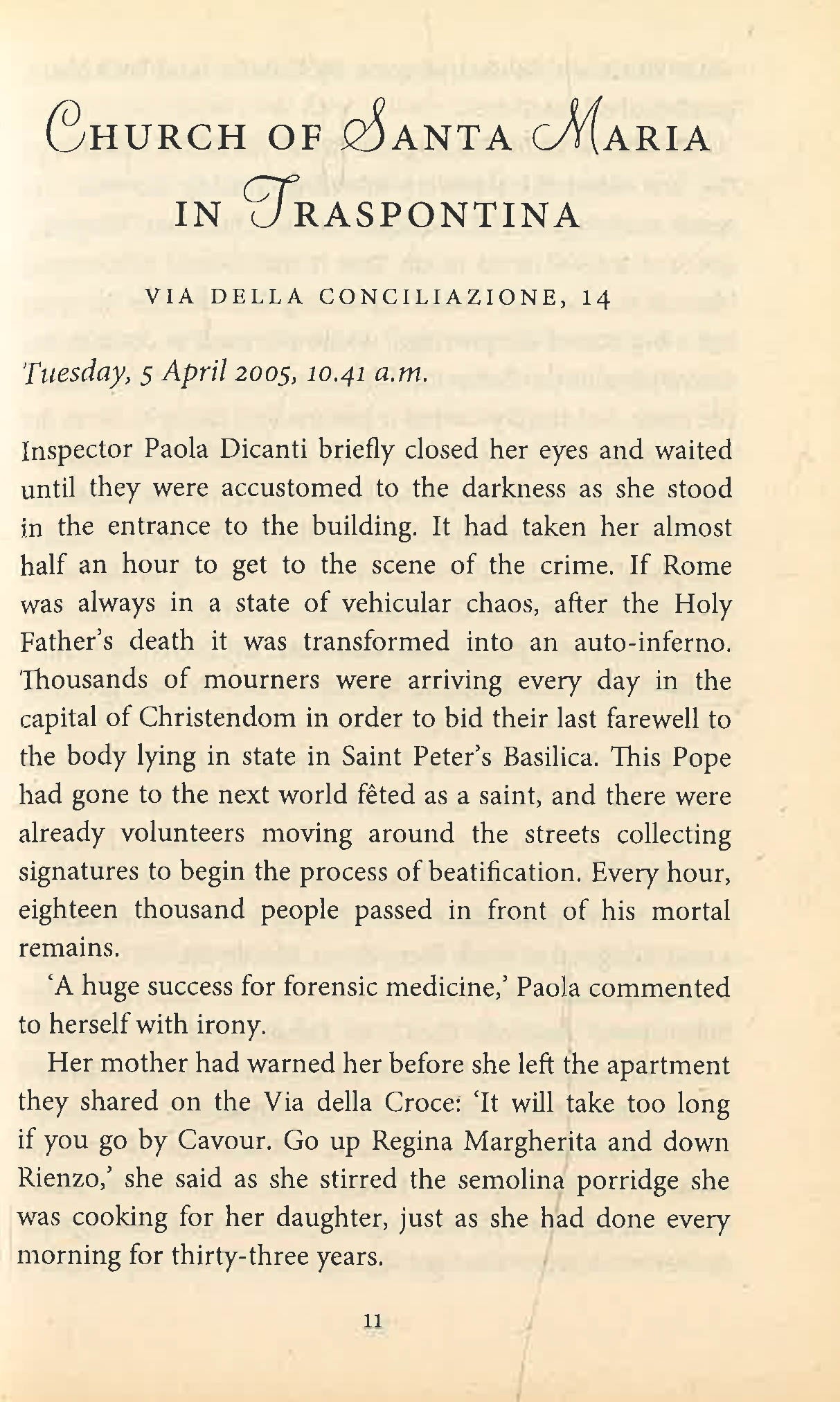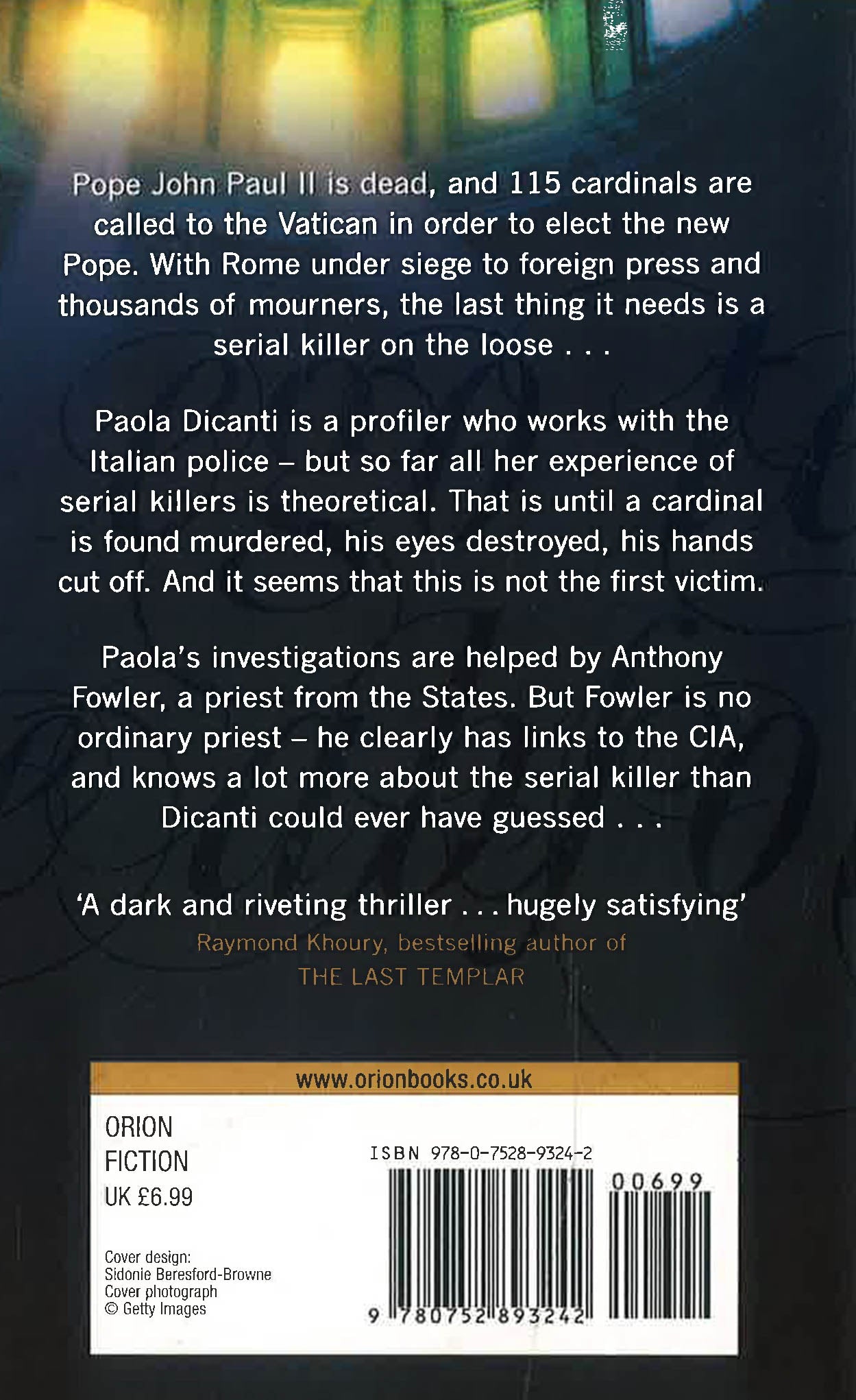A serial killer is on the loose in the Vatican... In the days following the death of Pope John Paul II, 115 cardinals are called to the Vatican in order to take part in the conclave and elect the new Pope. With Rome under siege to foreign press and thousands of mourners, the last thing it needs is a serial killer on the loose...Paola Dicanti is a profiler who works with the Italian police. She has been put in charge of profiling serial killers in a department of one - i.e. herself - but so far all her experience of serial killers is theoretical. This is until she is called to the church of Santa Maria in the Vatican state. A cardinal has been found murdered, his eyes destroyed, his hands cut off. It seems that this is not the first victim - another cardinal was found in similar circumstances but the authorities didn't want a scandal. Recovering from a bitter affair with her boss, Paola begins to build her profile using information from the scene of the crime, from the autopsy, and from forensic evidence. She is helped in this by Anthony Fowler, a priest from the States. But it turns out that Fowler is no ordinary priest - he clearly has links to the CIA, and knows a lot about the serial killer than Dicanti could ever have guessed...