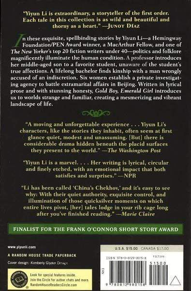 In these spellbinding stories, Yiyun Li, a Hemingway Foundation/PEN Award winner, a MacArthur Fellow, and one of The New Yorker's top 20 fiction writers under 40, gives us exquisite stories in which politics and folklore magnificently illuminate the human condition. A professor introduces her middle-aged son to a favorite student, unaware of the student's true affections. A lifelong bachelor finds kinship with a man wrongly accused of an indiscretion. Six women establish a private investigating agency to battle extramarital affairs in Beijing. Written in lyrical prose and with stunning honesty, Gold Boy, Emerald Girl introduces us to worlds strange and familiar, creating a mesmerizing and vibrant landscape of life. Look for special features inside. Join the Circle for author chats and more.
