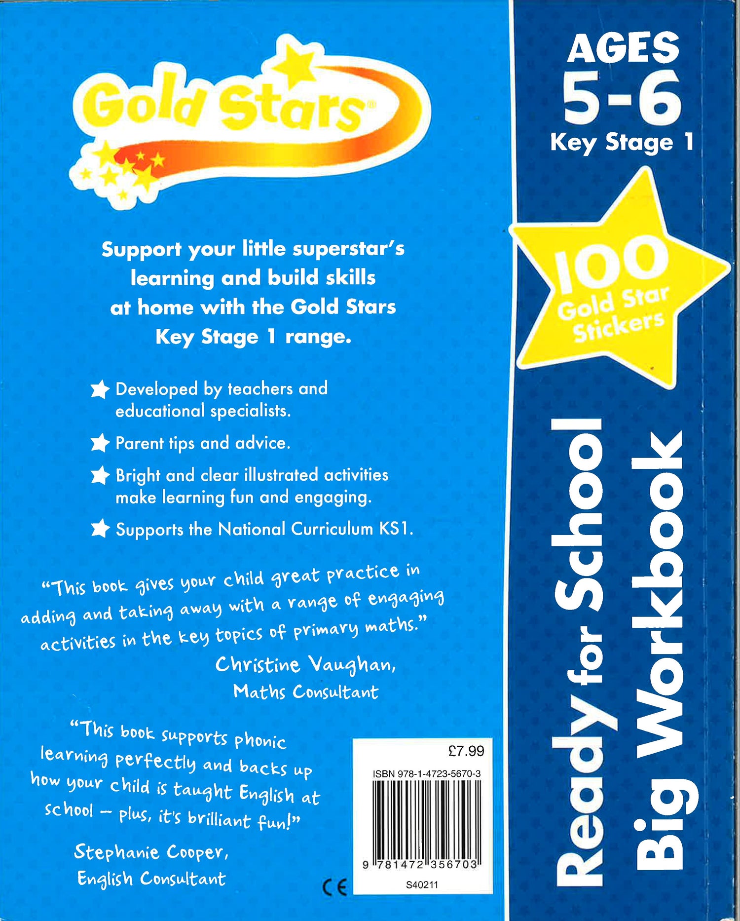 Support your little superstar's maths and English learning and build skills at home with the Gold Stars Key Stage 1 range. Developed by expert authors and consultants, this bumper workbook comes complete with parent tips and advice and over 100 gold star reward stickers. Your child will gain great practice in adding and taking away with a range of engaging activities in the key topics of primary maths. This book supports phonic learning perfectly and backs up how your child is taught English at school - plus, it's brilliant fun!