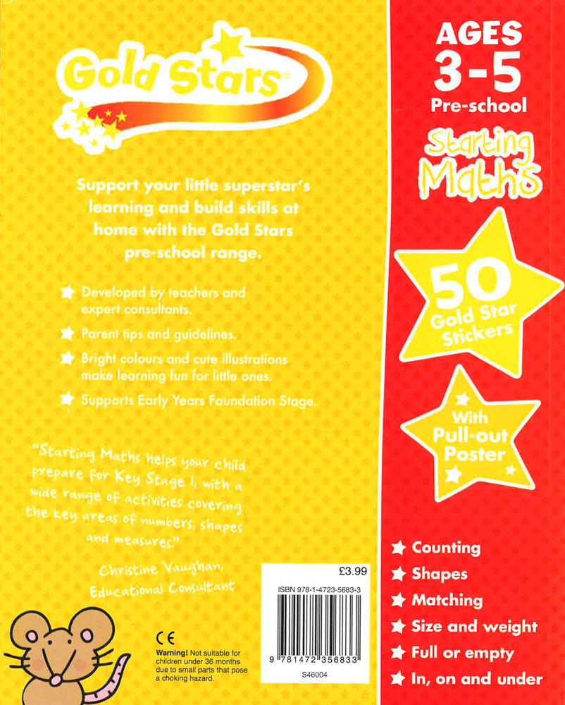 Support your little superstar's learning and build skills at home with the Gold Stars pre-school range. Starting Maths helps your child prepare for Key Stage 1, with a wide range of activities covering the key areas of numbers, shapes and measures. Includes a page of gold star stickers to reward good work, and a poster. Gold Stars Workbooks: - Are developed by teachers and educational specialists - Include parent tips and advice - Have bright and clear illustrated activities to make learning fun and engaging - Support the Early Years Foundation Stage.