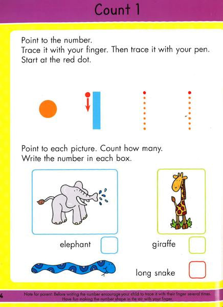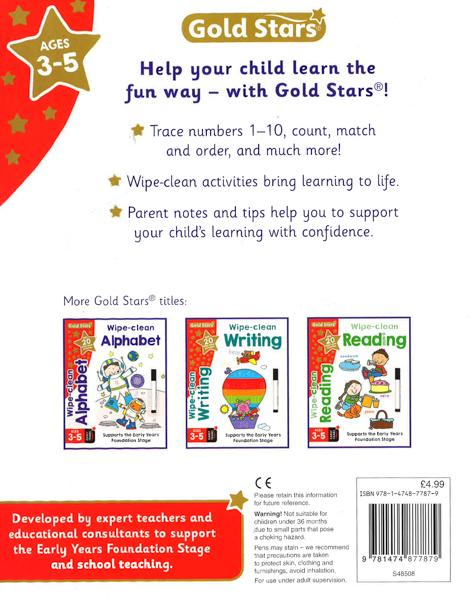 Gold Stars workbooks are great tools to help your child grow and learn. Gold Stars Wipe-Clean Numbers Ages 3-5 is a great book to teach your child numbers with a wipe-clean activity book that allows them to write, wipe, and write again.