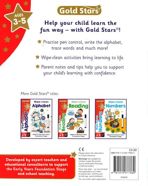 Gold Stars workbooks are great tools to help your child grow and learn. Gold Stars Wipe-Clean Writing Ages 3-5 is a great book to teach your child writing with a wipe-clean activity book that allows them to write, wipe, and write again.
