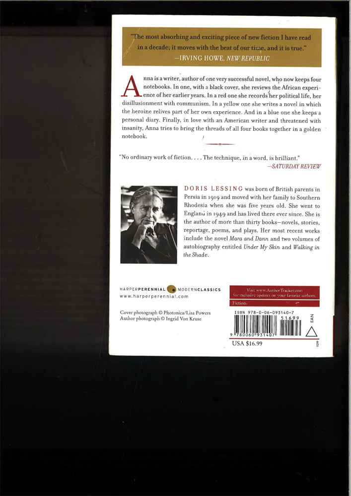 Anna is a writer, author of one very successful novel, who now keeps four notebooks. In one, with a black cover, she reviews the African experience of her earlier year. In a red one she records her political life, her disillusionment with communism. In a yellow one she writes a novel in which the heroine reviles part of her own experience. And in the blue one she keeps a personal diary. Finally, in love with an American writer and threatened with insanity, Anna tries to bring the threads of all four books together in a golden notebook.