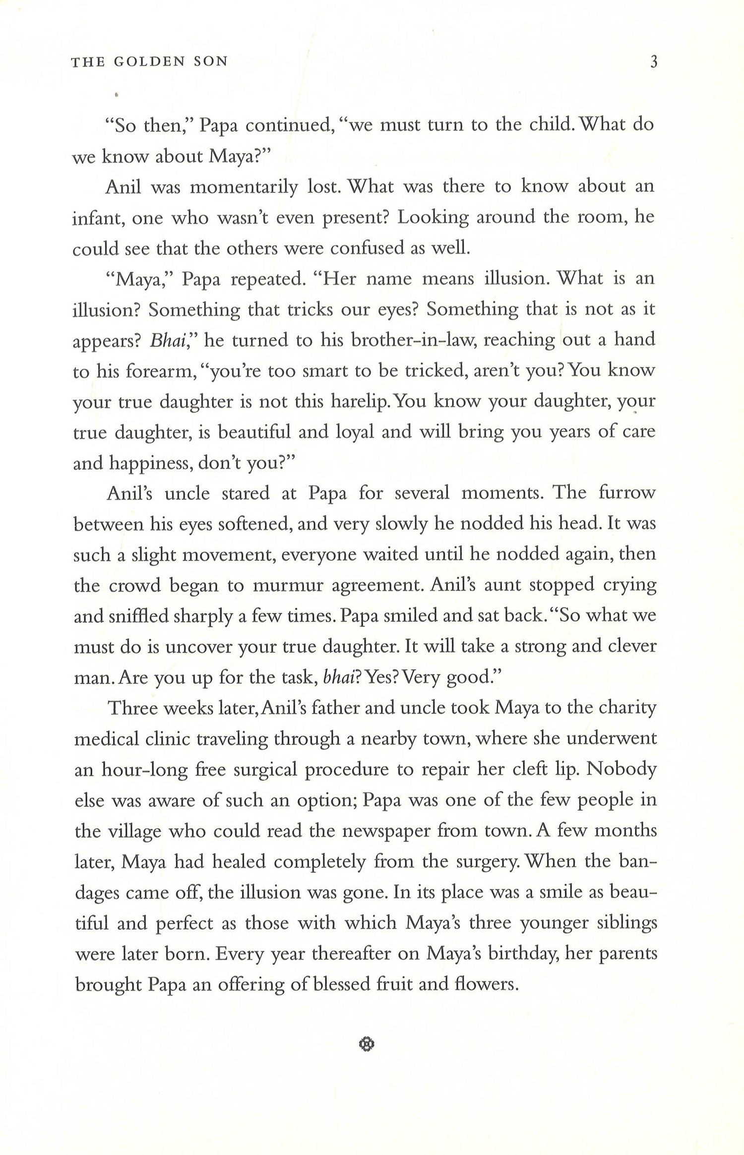 The New York Times and #1 internationally bestselling author of Secret Daughter returns with an unforgettable story of family, responsibility, love, honor, tradition, and identity, in which two childhood friends - a young doctor and a newly married bride - must balance the expectations of their culture and their families with the desires of their own hearts. The first of his family to go to college, Anil Patel, the golden son, carries the weight of tradition and his family s expectations when he leaves his tiny Indian village to begin a medical residency in Dallas, Texas, at one of the busiest and most competitive hospitals in America. When his father dies, Anil becomes the de facto head of the Patel household and inherits the mantle of arbiter for all of the village s disputes. But he is uneasy with the custom, uncertain that he has the wisdom and courage demonstrated by his father and grandfather. His doubts are compounded by the difficulties he discovers in adjusting to a new culture and a new job, challenges that will shake his confidence in himself and his abilities. Back home in India, Anil s closest childhood friend, Leena, struggles to adapt to her demanding new husband and relatives. Arranged by her parents, the marriage shatters Leena s romantic hopes, and eventually forces her to make a desperate choice that will hold drastic repercussions for herself and her family. Though Anil and Leena struggle to come to terms with their identities thousands of miles apart, their lives eventually intersect once more - changing them both and the people they love forever. Tender and bittersweet, The Golden Son illuminates the ambivalence of people caught between past and present, tradition and modernity, duty and choice; the push and pull of living in two cultures, and the painful decisions we must make to find our true selves.