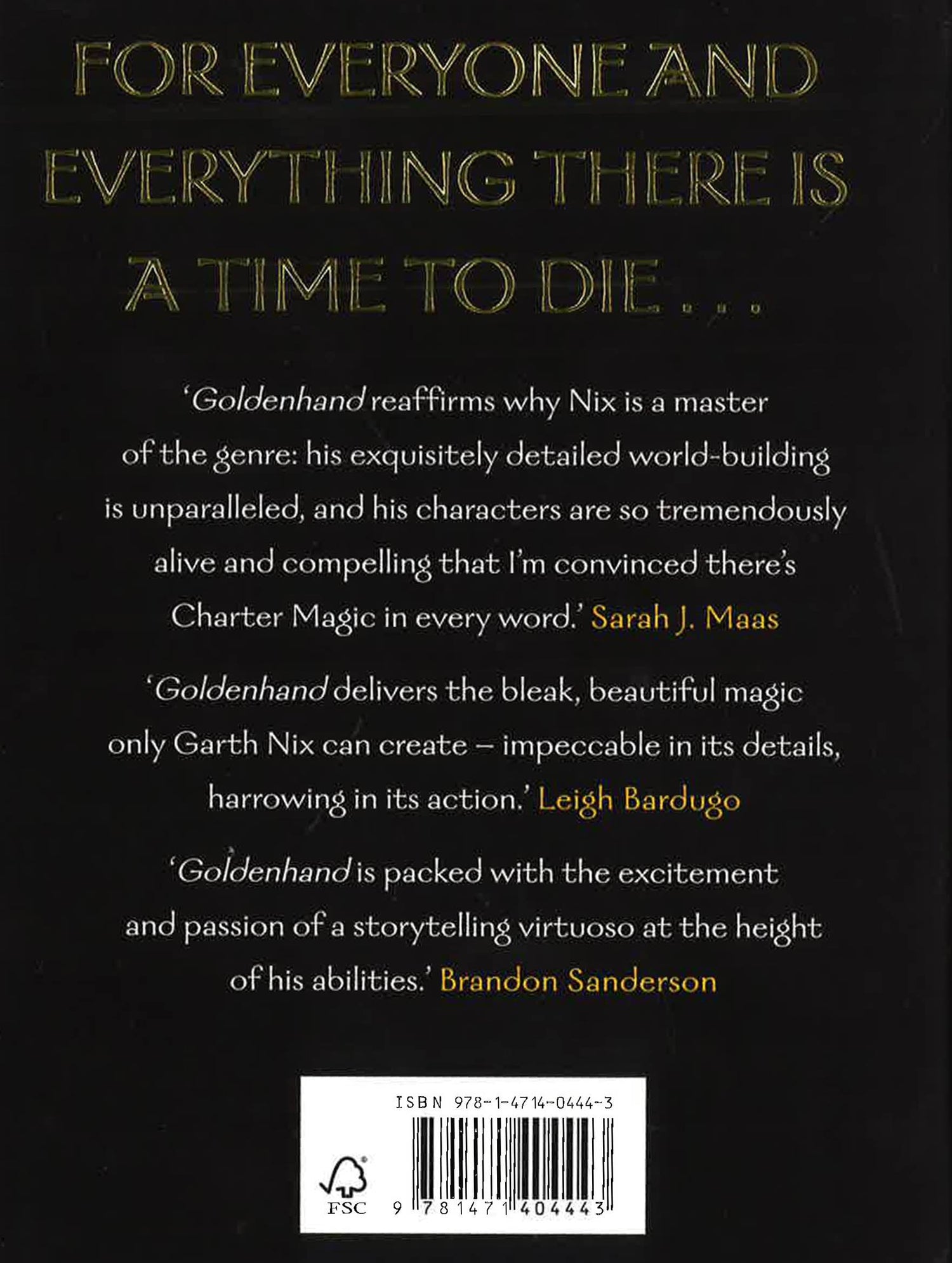 Goldenhand is the long-awaited fifth installment of Garth Nix's New York Times bestselling Old Kingdom series Lirael is no longer a shy Second Assistant Librarian. She is the Abhorsen-in-Waiting, with dead creatures to battle and Free Magic entities to bind. She's also a Remembrancer, and wielder of the Dark Mirror. When Lirael finds Nicholas Sayre lying unconscious after being attacked by a hideous Free Magic creature, she uses her powers to save him. But Nicholas is deeply tainted with Free magic and Lirael must seek help for him at her childhood home, the Clayr's Glacier. But even as she returns to the Clayr, a messenger is trying to reach Lirael with a dire warning from her long-dead mother, Arielle, about the Witch with No Face. But who is the Witch, and what is she planning? Once more a great danger threatens the Old Kingdom, and it must be forestalled not only in the living world, but also in the cold, remorseless river of Death.