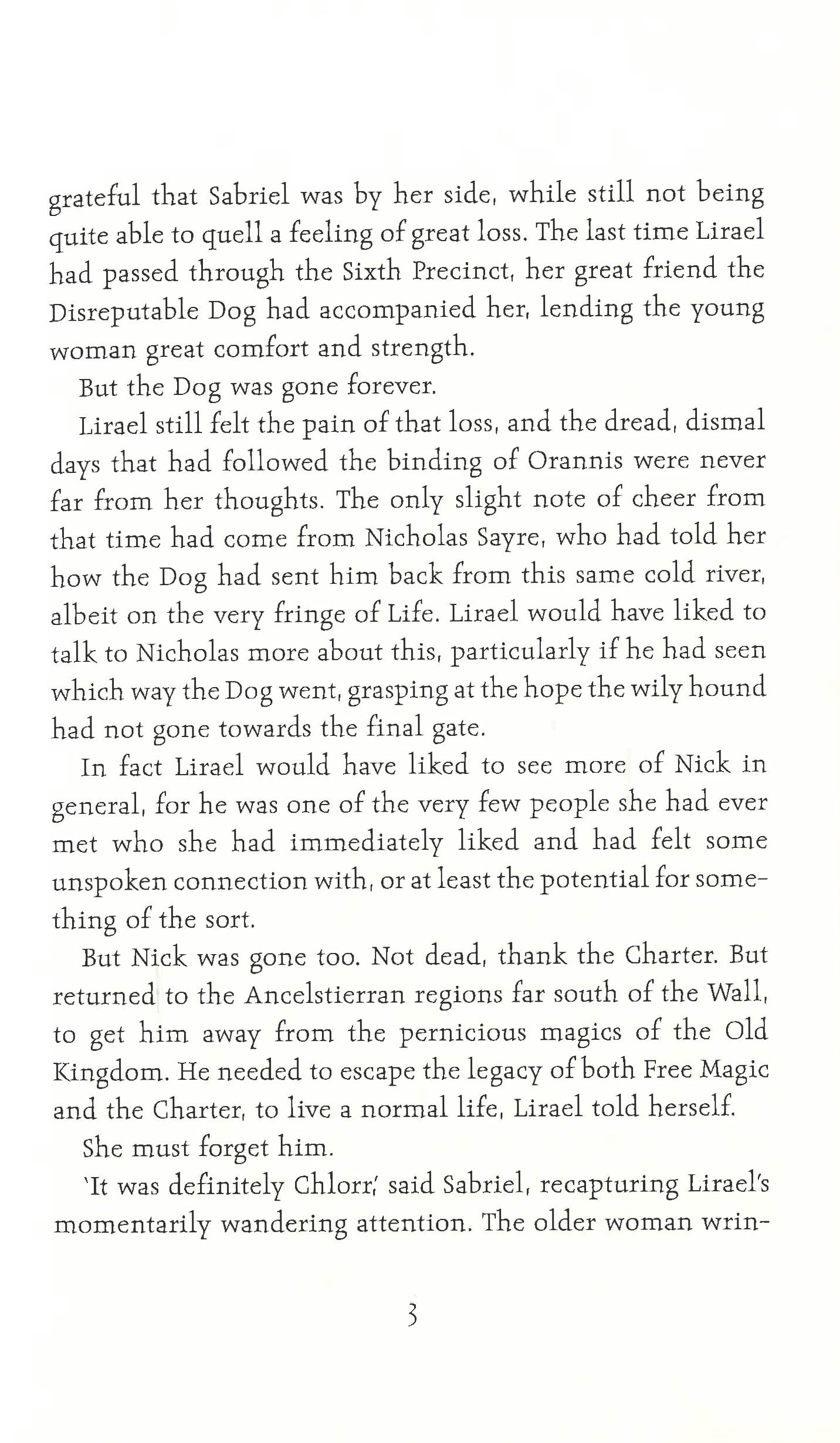 She's also a Remembrancer, and wielder of the Dark Mirror. When Lirael finds Nicholas Sayre lying unconscious after being attacked by a hideous Free Magic creature, she uses her powers to save him. But Nicholas is deeply tainted with Free magic and Lirael must seek help for him at her childhood home, the Clayr's Glacier.