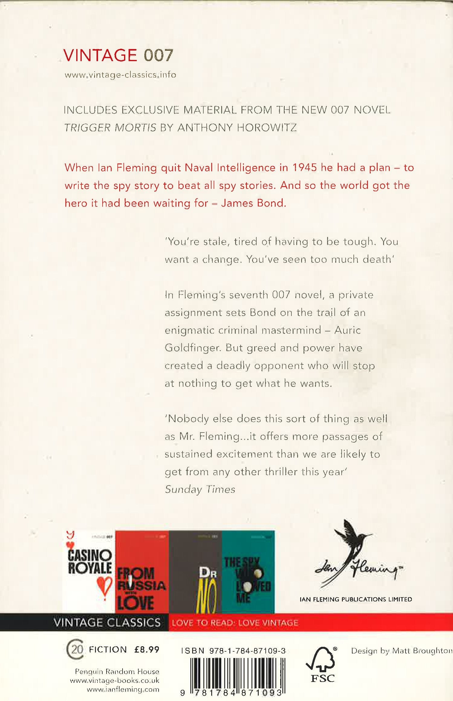 In Fleming's seventh 007 novel, a private assignment sets Bond on the trail of an enigmatic criminal mastermind - Auric Goldfinger. But greed and power have created a deadly opponent who will stop at nothing to get what he wants.