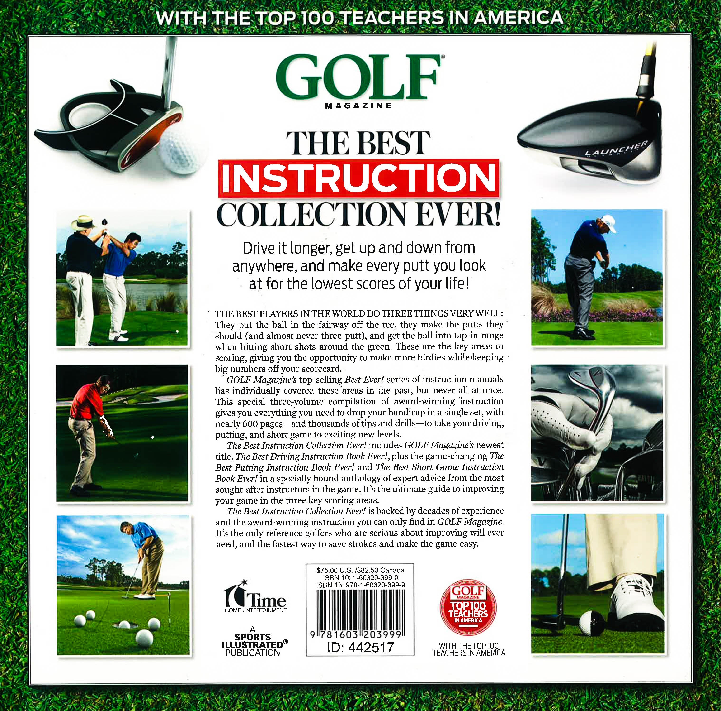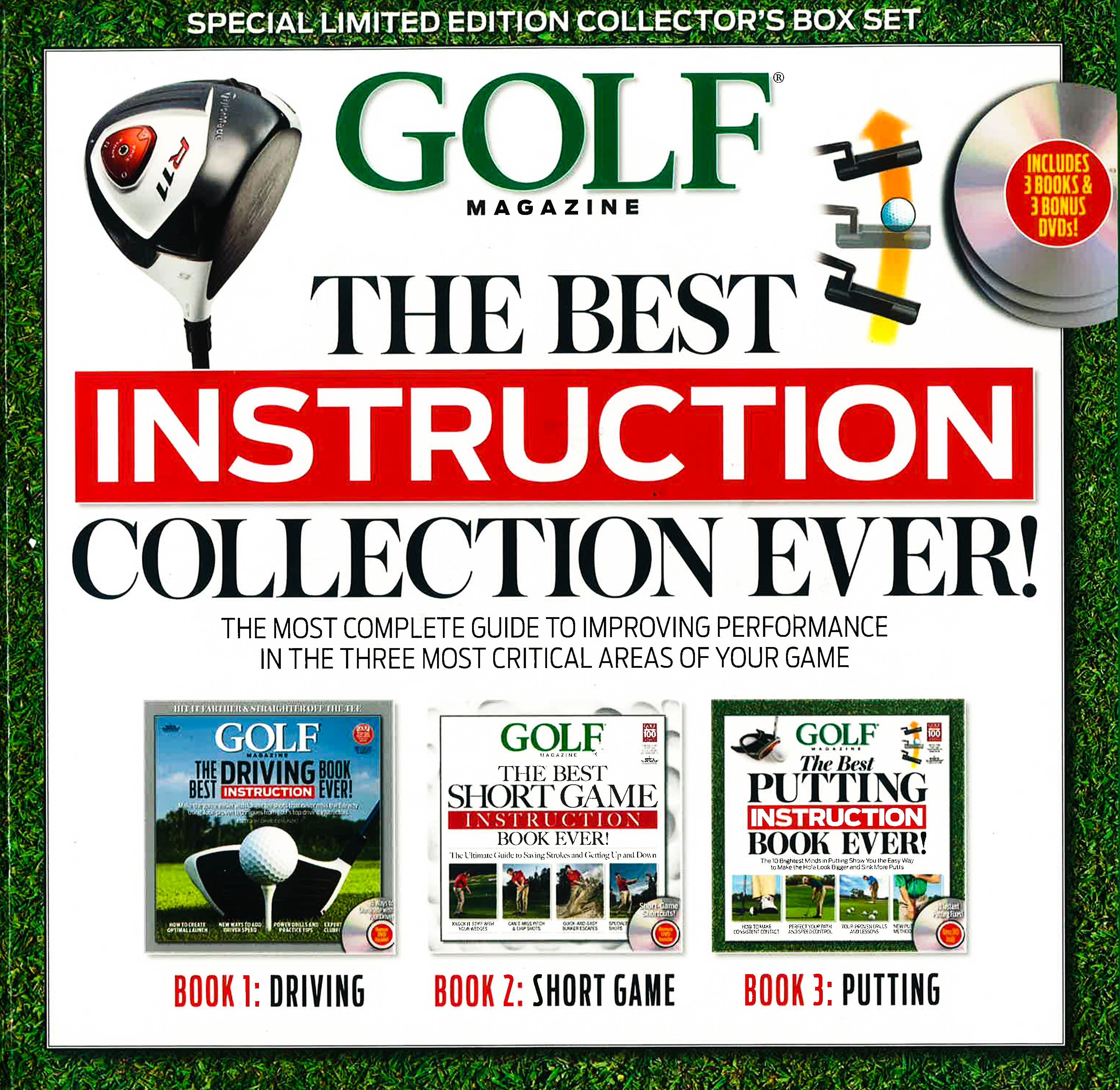 The most complete guide to improving performance in the three most critical areas of your game The best players in the world do three things very well: They put the ball in the fairway off the tee, they make the putts they should (and almost never three putt), and get the ball into tap-in range when hitting short shots around the green after an errant approach. These are the key areas to scoring, giving you both the opportunity to make more birdies and keeping big numbers off your scorecard. "GOLF Magazine's" top-selling "Best Ever!" series of instruction manuals have individually covered these areas in the past, but never all at once. Now offered as a special three-volume compilation of award-winning instruction from the Top 100 Teachers in America, "The Best Instruction Collection Ever!" gives you everything you need to drop your handicap in a single set, with nearly 600 pages-and thousands of tips and drills-to take your driving, putting and short game to exciting new levels. "The Best Instruction Collection Ever!"""includes "GOLF Magazine's" newest title, "The Best Driving Instruction Book Ever!," plus it's game-changing "The Best Putting Instruction Book Ever!" and "The Best Short Game Instruction Book Ever! "in a specially bound anthology of expert advice from the most sought-after instructors in the game. Three bonus DVDs featuring video lessons that support the book lessons also are included, making the collection golf's most complete guide to improving your game in the three key scoring areas. "The Best Instruction Collection Ever!, " like all of the magazine's lesson manuals, is backed by decades of experience and the award-winning instruction you can only find in "GOLF Magazine." It's the only reference golfers who are serious about improving will ever need, and the fastest way to save strokes and make the game easy.