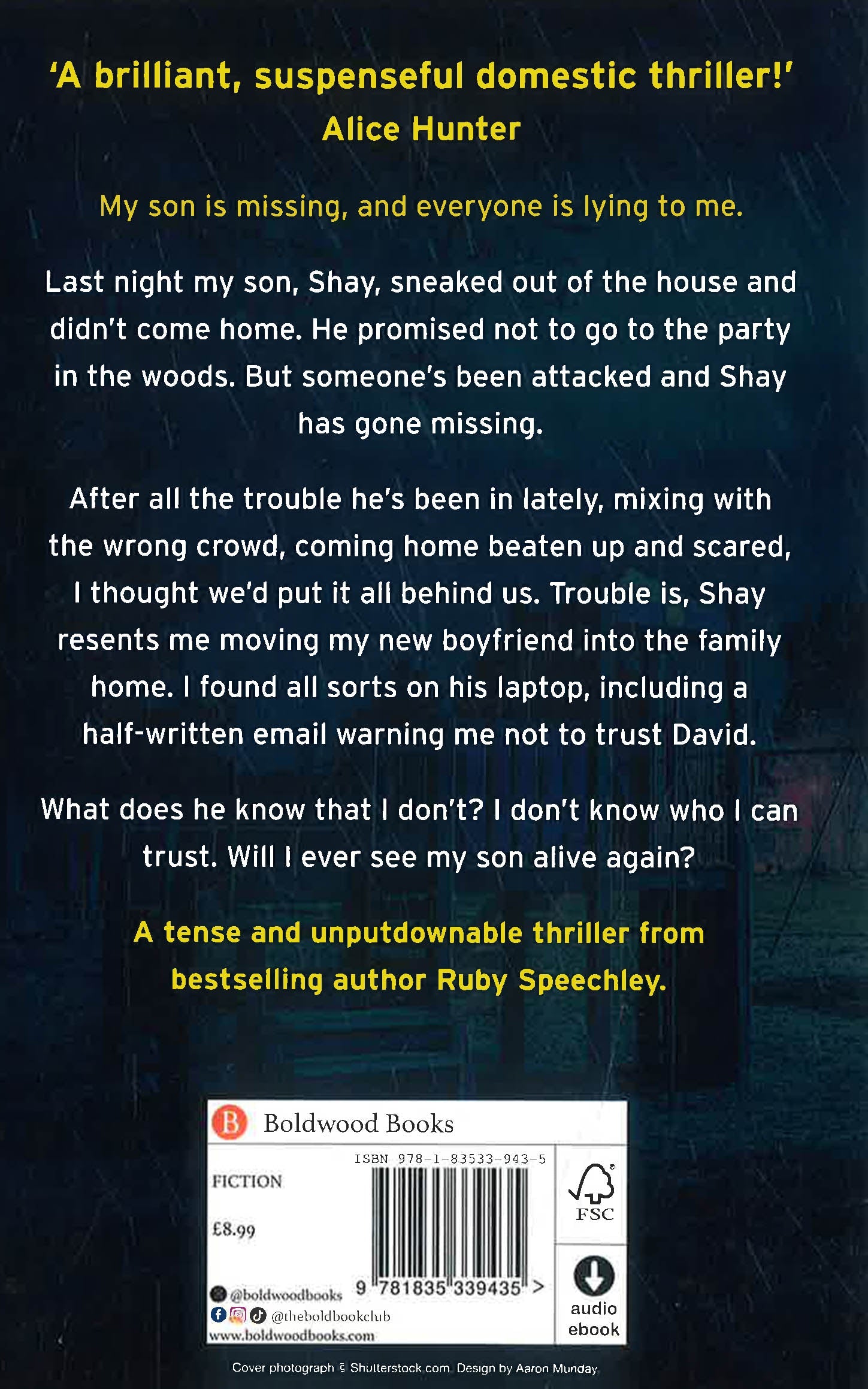 Last night my son, Shay, sneaked out of the house and didn't come home. He promised not to go to the illegal party in the woods. But someone's been attacked and Shay has gone missing. The police want to know if he saw what happened. I'm worried he could be involved.