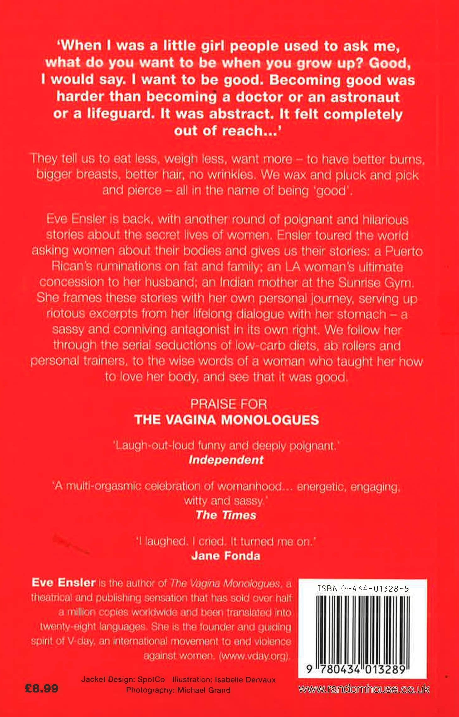 Botox, bulimia, breast implants, stomach tucks - Eve Ensler is back, with another round of poignant and hilarious stories about the secret lives of women. Here are our intimate obsessions laid bare - who hasn't hungered for shapelier thighs, a nip or tuck or just a little piercing? Ensler toured the world asking women about their anatomical obsessions and gives us their stories: a Puerto Rican's ruminations on fat and family, an Indian beauty's obsession with hair, an LA woman's ultimate concession to her husband. She frames these stories with her own personal journey, serving up riotous excerpts from her lifelong dialogue with her belly - a sassy and conniving antagonist in its own right. We follow her through the serial seductions of low carb diets, ab rollers and personal trainer to the wise words of a woman who taught her how to love her body, and see that it was good.