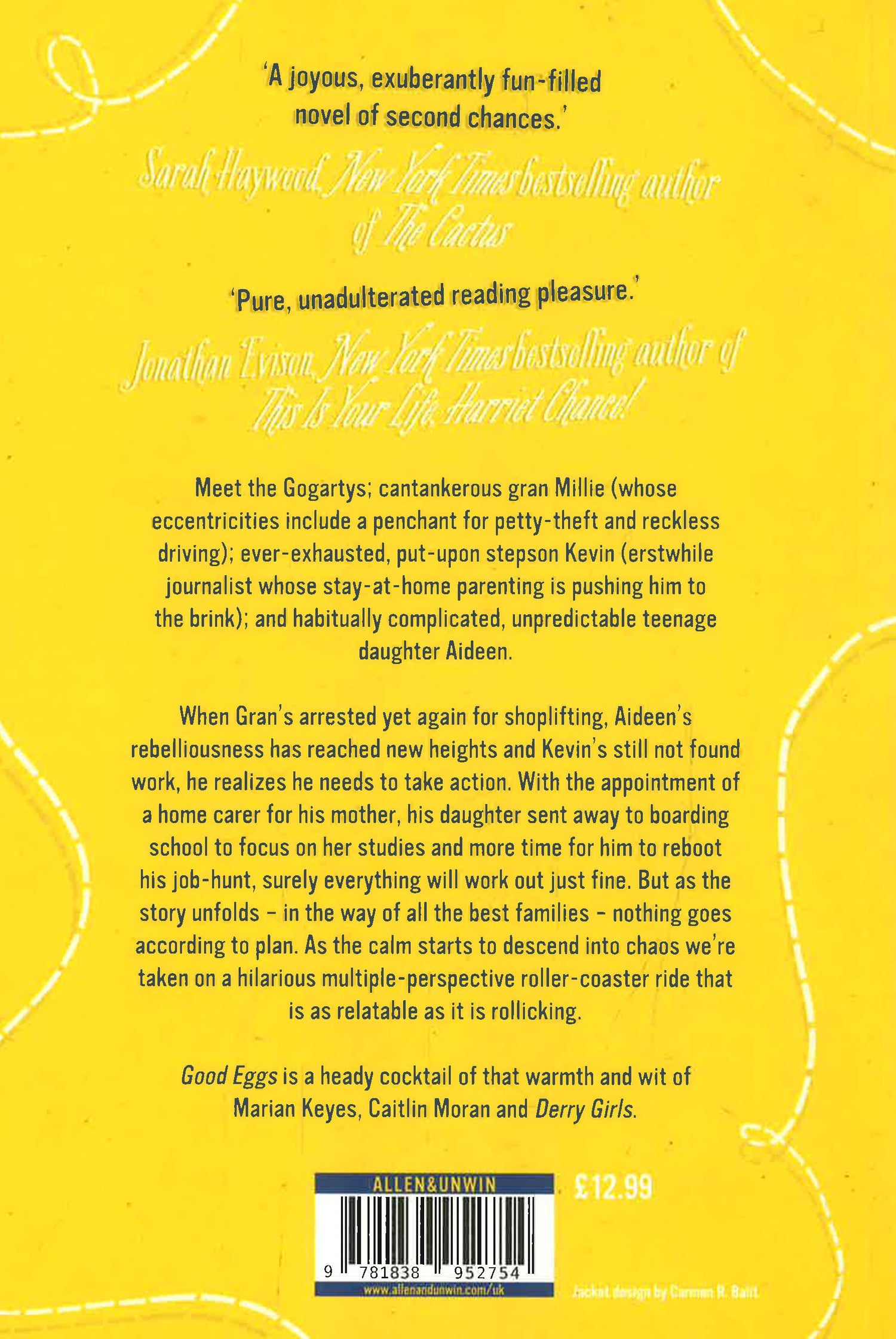 Meet the Gogartys: cantankerous gran Millie (whose eccentricities include a penchant for petty-theft and reckless driving); bitter downtrodden stepson Kevin (erstwhile journalist whose stay-at-home parenting is pushing him to the brink); and habitually moody, disaffected teenage daughter Aideen.When Gran's arrested yet again for shoplifting, Aideen's rebelliousness has reached new heights and Kevin's still not found work, he realises he needs to take action. With the appointment of a home carer for his mother, his daughter sent away to boarding school to focus on her studies and more time for him to reboot his job-hunt, surely everything will work out just fine. But as the story unfolds - and in the way of all the best families - nothing goes according to plan and as the calm starts to descend into chaos we're taken on a hilarious multiple-perspective roller-coaster ride that is as relatable as it is far-fetched.Good Eggs is a heady cocktail of that warmth and wit of Marian Keyes, Caitlin Moran and TV's Derry Girls.