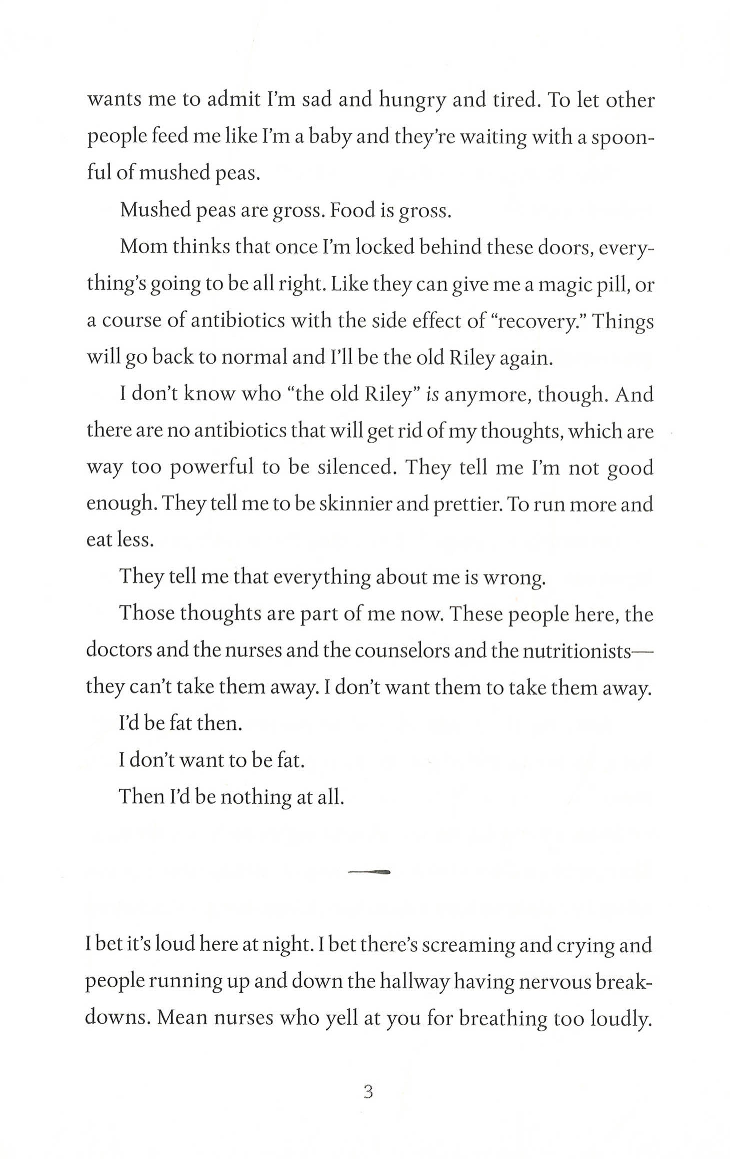 Before she had an eating disorder, twelve-year-old Riley was many things: an aspiring artist, a runner, a sister, and a friend. But now, from inside the inpatient treatment center where she's receiving treatment for anorexia, it's easy to forget all of that. Especially since under the influence of her eating disorder, Riley alienated her friends, abandoned her art, turned running into something harmful, and destroyed her family's trust. If Riley wants her life back, she has to recover. Part of her wants to get better. As she goes to therapy, makes friends in the hospital, and starts to draw again, things begin to look up. But when her roommate starts to break the rules, triggering Riley's old behaviors and blackmailing her into silence, Riley realizes that recovery will be even harder than she thought. She starts to think that even if she does recover, there's no way she'll stay recovered once she leaves the hospital and is faced with her dieting mom, the school bully, and her gymnastics-star sister. Written by an eating disorder survivor and activist, Good Enough is a realistic depiction of inpatient eating disorder treatment, and a moving story about a girl who has to fight herself to survive.