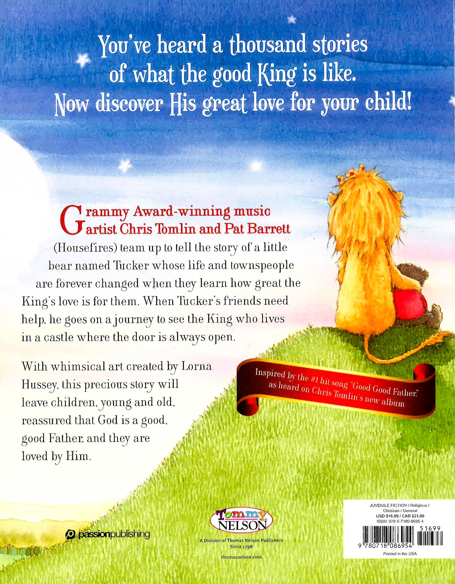 Grammy Award-winning music artist, Chris Tomlin, and Pat Barrett (Housefires) team up to tell the story of a little bear named Tucker whose life is forever changed when he learns just how great the King's love is for him. When Tucker's friends need help, he journeys to see the King who lives in a castle where the door is always open. Along the way, Tucker encounters a variety of humorous animals filled with ideas about what the King is like. Then finally, he meets the King who runs to him with open arms.