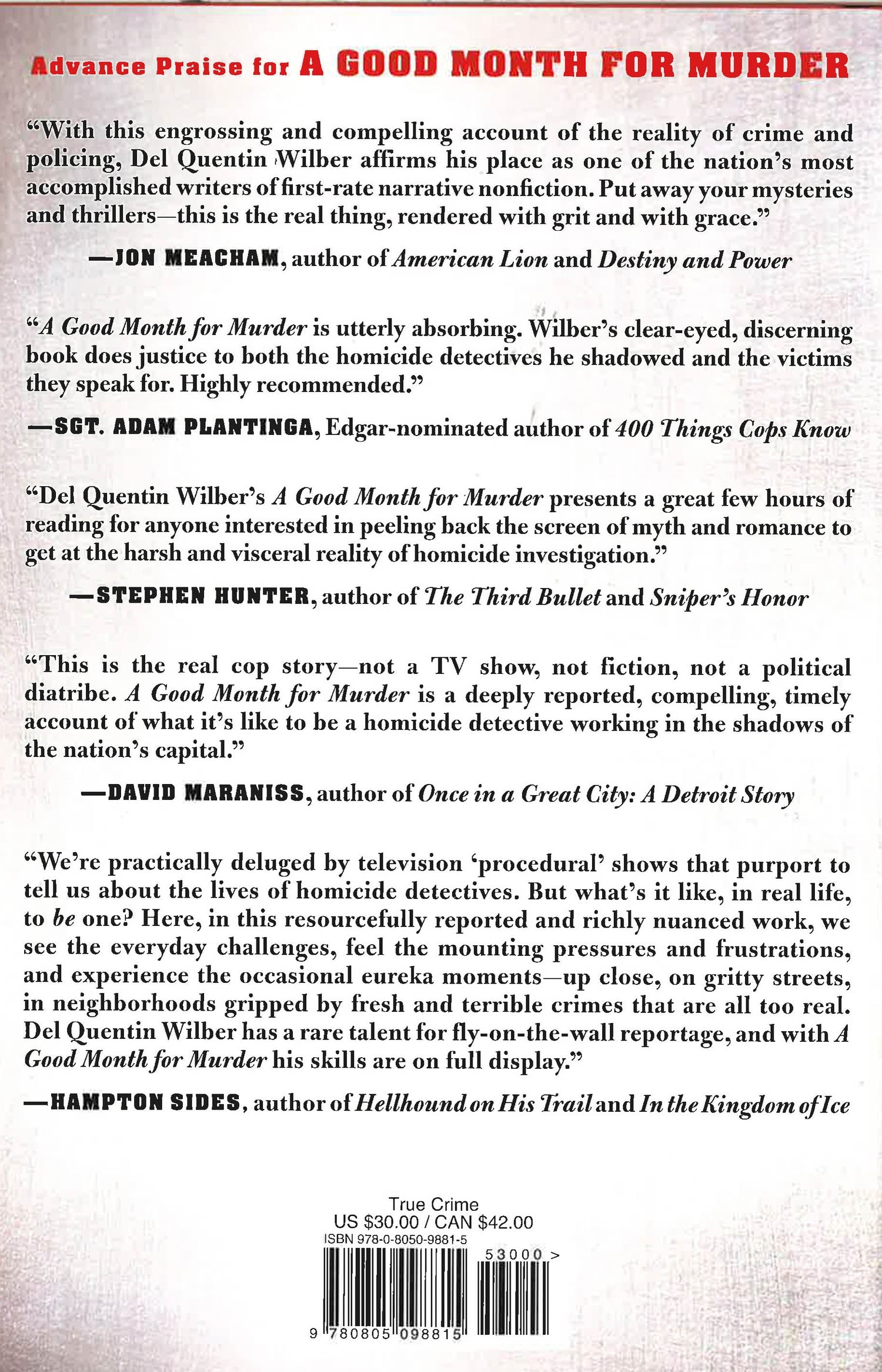 Bestselling author Del Quentin Wilber tells the inside story of how a homicide squad - a dedicated, colorful team of detectives - does its almost impossible job.Twelve homicides, three police-involved shootings and the furious hunt for an especially brutal killer - February 2013 was a good month for murder in suburban Washington, D.C.After gaining unparalleled access to the homicide unit in Prince George's County, which borders the nation's capital, Del Quentin Wilber begins shadowing the talented, often quirky detectives who get the call when a body falls. After a quiet couple of months, all hell breaks loose: suddenly every detective in the squad is scrambling to solve one shooting and stabbing after another. Meanwhile, the entire unit is obsessed with a stone-cold "red ball," a high-profile case involving a seventeen-year-old honor student attacked by a gunman who kicked down the door to her house and shot her in her bed.Murder is the police investigator's ultimate crucible: to solve a killing, a detective must speak for the dead. More than any recent book, A Good Month for Murder shows what it takes to succeed when the stakes couldn't possibly be higher.