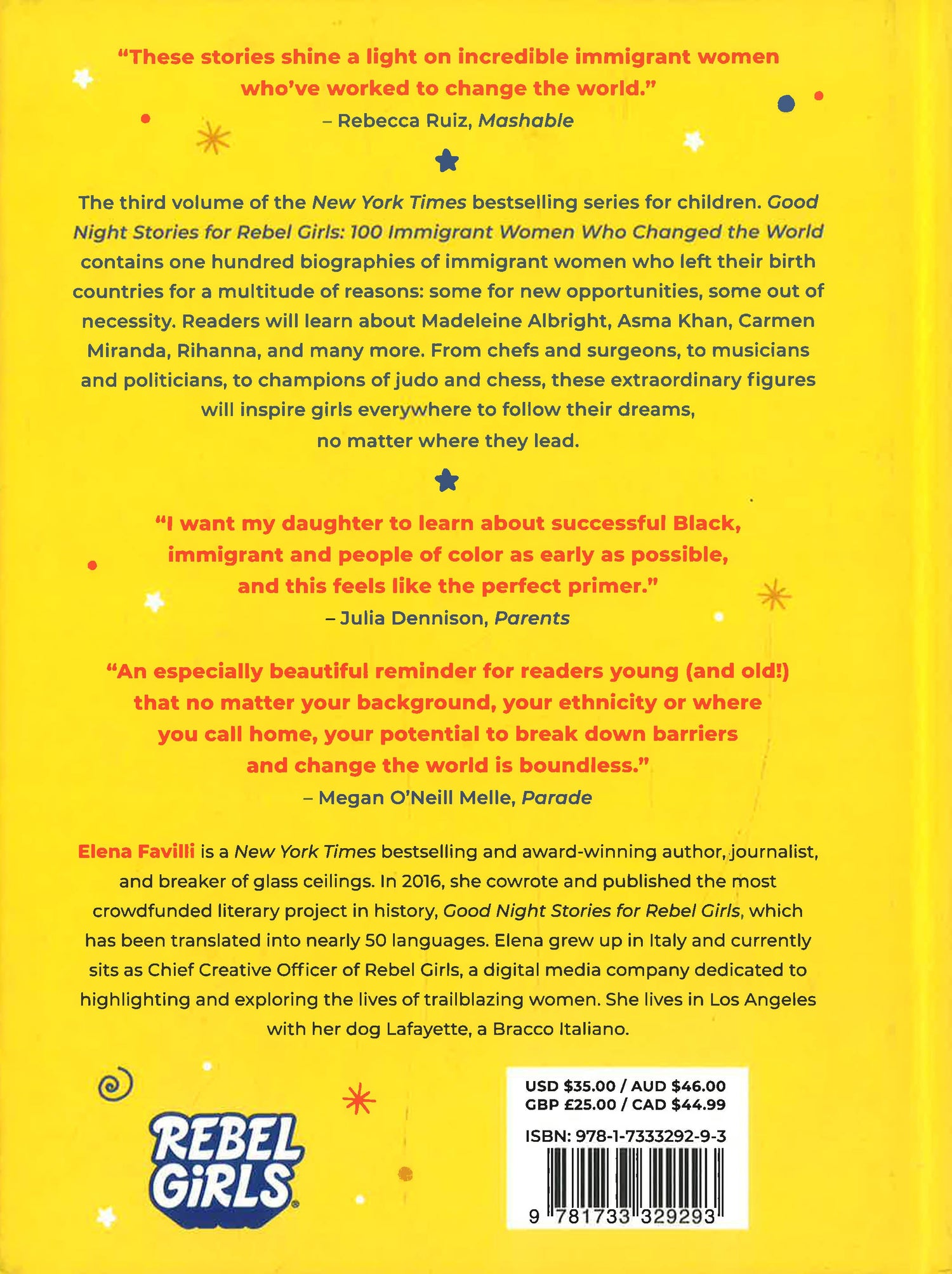A 2021 NATIONAL PARENTING PRODUCT AWARDS WINNER! The latest installment in the New York Times bestselling Good Night Stories for Rebel Girls series, featuring 100 immigrant women who have shaped, and will continue to shape, our world. Good Night Stories for Rebel Girls: 100 Immigrant Women Who Changed the World is the third book in the New York Times bestselling series for children. Packed with 100 all-new bedtime stories about the lives of incredible female figures from the past and the present, this volume recognizes women who left their birth countries for a multitude of reasons: some for new opportunities, some out of necessity. Readers will whip up a plate with Asma Khan, strategize global affairs alongside Madeleine Albright, venture into business with Rihanna, and many more. All of these unique, yet relatable stories are accompanied by gorgeous, full-page, full-color portraits, illustrated by female artists from all over the globe.