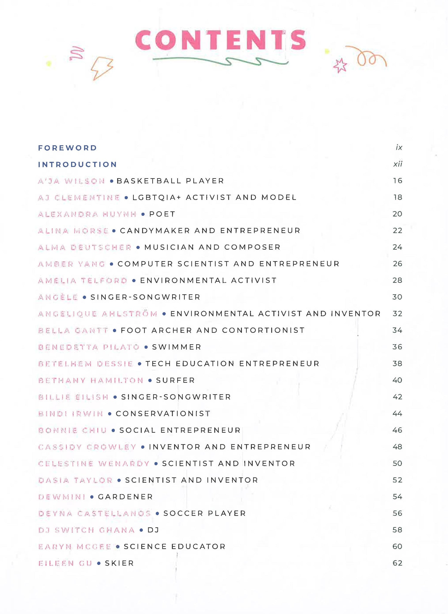 Readers will celebrate well-known women, like Greta Thunberg, Bethany Hamilton, Bindi Irwin, Zendaya, and the Linda Lindas, and meet up-and-coming powerhouses like inventor Vinisha Umashankar, fashion designer Marine Serre, stuntwoman Sadiqua Bynum, filmmaker Taegen Yardley, poet Alexandra Huynh, and environmental activist Helena Gualinga.