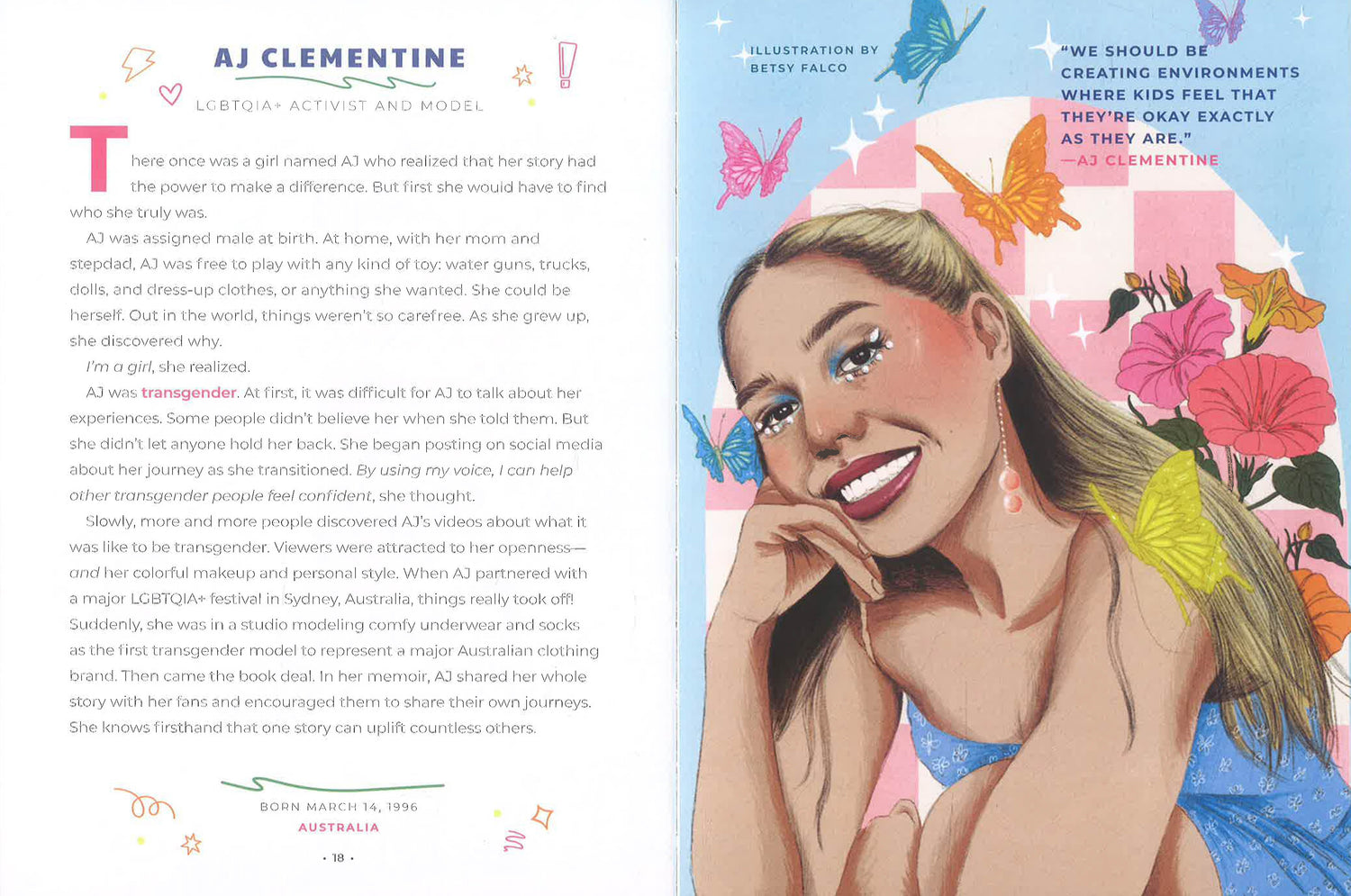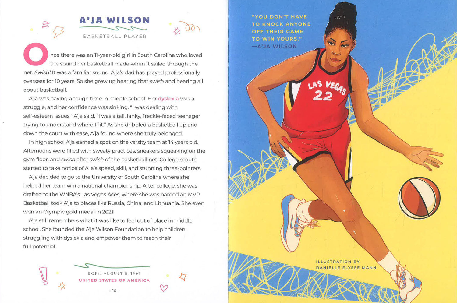 The girls and women in the book come from different countries and backgrounds and have a wide array of interests and accomplishments. Barrier-breaking performer Keke Palmer became the youngest talk show host in US history. Entrepreneur Mikaila Ulmer founded a lemonade company to help save honeybees. Brazilian skateboarder Rayssa Leal turned a hobby into an Olympic dream. And British body positivity advocate Megan Jayne Crabbe and Indigenous artist Te Manaia Jennings inspire kids to keep their minds healthy.