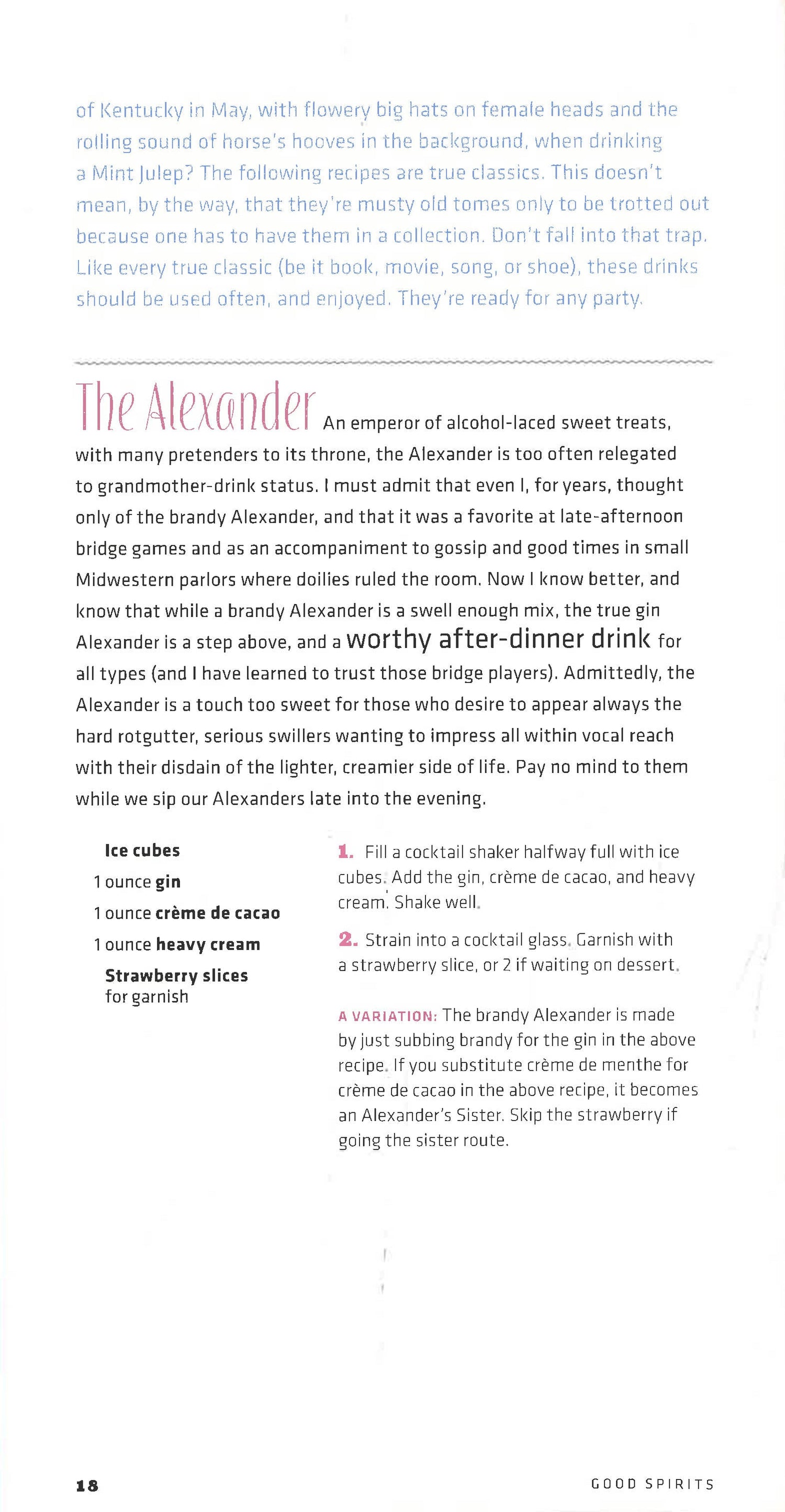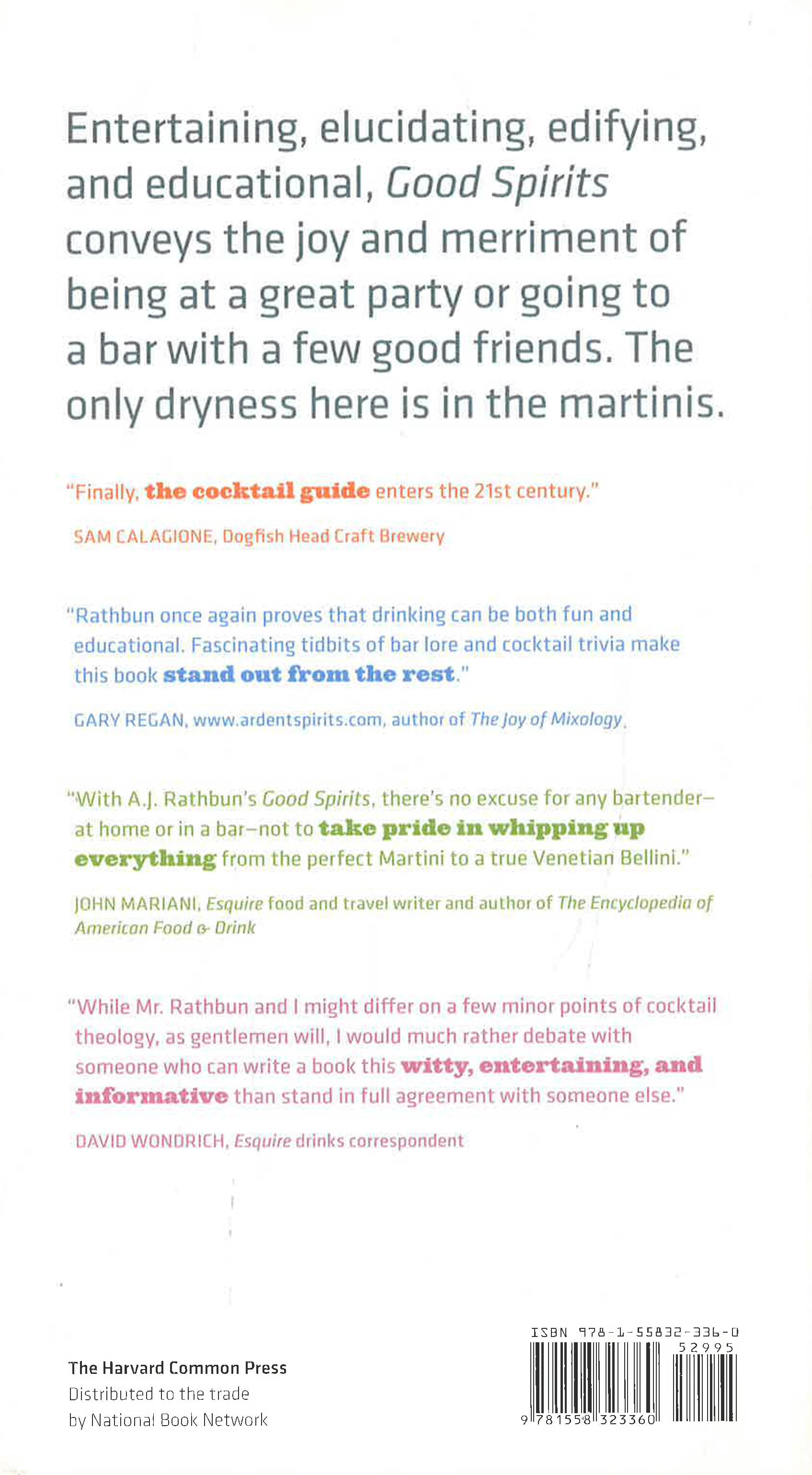 In Good Spirits, A.J. Rathbun has collected 450 of the best cocktail recipes, featuring an incredible variety of spirits, mixers, and garnishes. With its stunning, full-color photographs and fresh, lively tone, this is the definitive guide to both classic and contemporary drinks for anyone who appreciates the art of the cocktail. The recipes in Good Spirits are organized by theme, so it's easy to find the perfect drink for every mood and occasion. The 12 chapters include "Cool It Down" (summer drinks, such as the Bellini and the Gin Fizz), "Gold Standards" (classics such as the Manhattan and the Sidecar), and "Fresh Faces" (creative new drinks, such as the Dublin 8 and Urban Bourbon). Hosting a party? Mix up a bowl of Champagne Punch. Preparing a romantic evening for two? Opt for the Cupid Cocktail or a couple of Silk Stockings. For anyone who wants to go beyond mixing a few new cocktails and become a home bartender, a thorough introduction provides information on all the different varieties of liquors and mixers, glassware, and essential equipment. Throughout the book, Rathbun's unabashed passion for and knowledge of his subject are clear in engaging headnotes and sidebars such as "Four Drinks to Induce Dancing," "Top Five Movie Star Mixes," and "Four Drinks Not to Serve the In-laws." Good Spirits is like the perfect party: the drinks go down easy and everyone, from the casual cocktail drinker to the connoisseur, will have a great time.