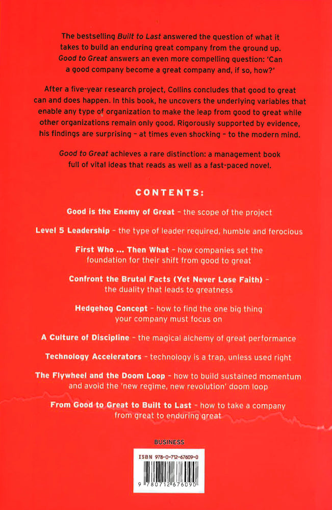 Rigorously supported by evidence, his findings are surprising - at times even shocking - to the modern mind.Good to Great achieves a rare distinction: a management book full of vital ideas that reads as well as a fast-paced novel.________________________________Can a good company become a great one? If so, how?After a five-year research project, Jim Collins concludes that good to great can and does happen. In this book, he uncovers the underlying variables that enable any type of organisation to make the leap from good to great while other organisations remain only good. Rigorously supported by evidence, his findings are surprising - at times even shocking - to the modern mind.Good to Great achieves a rare distinction: a management book full of vital ideas that reads as well as a fast-paced novel. It is widely regarded as one of the most important business books ever written.