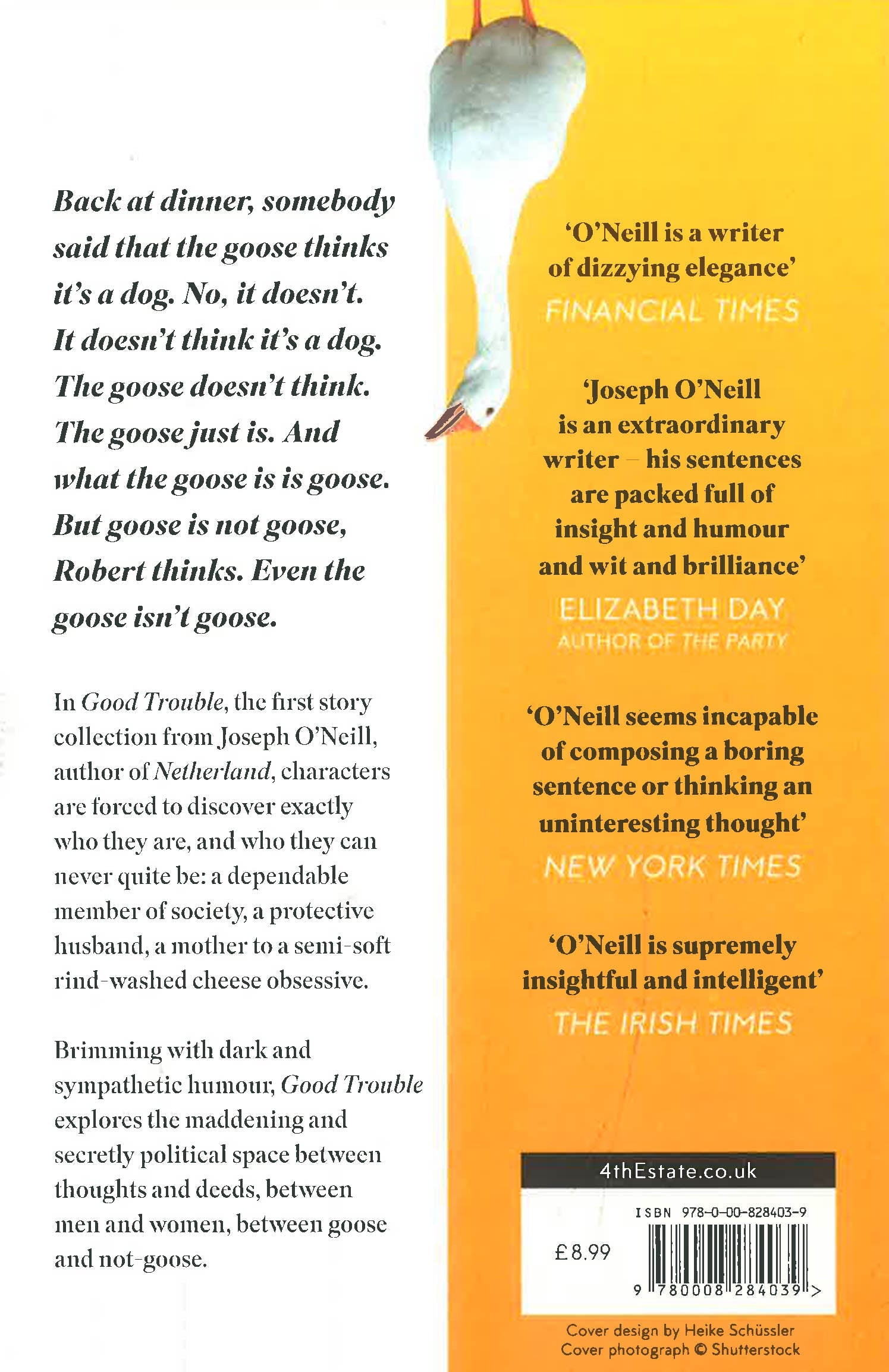 Packed with O’Neill’s trademark acerbic humour, Good Trouble explores the maddening and secretly political space between thoughts and deeds, between men and women, between goose and not-goose.