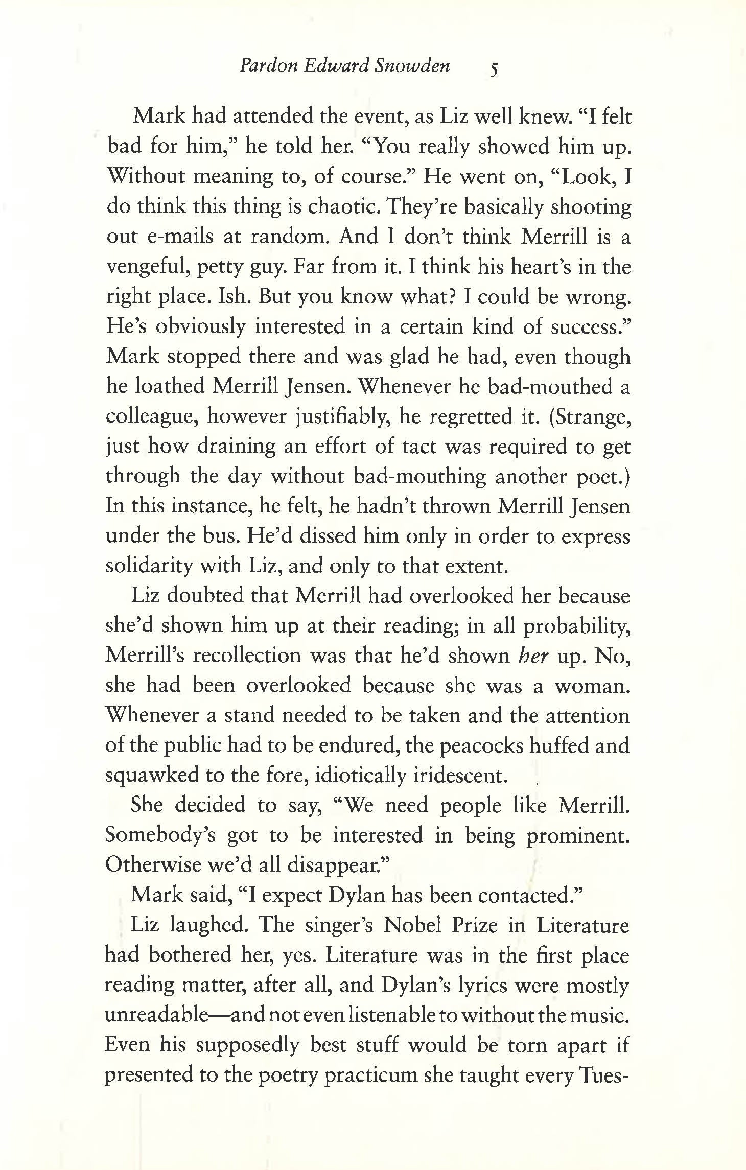 Back at dinner, somebody said that the goose thinks it’s a dog. No, it doesn’t. It doesn’t think it’s a dog. The goose doesn’t think. The goose just is. And what the goose is is goose. But goose is not goose, Robert thinks. Even the goose isn’t goose.