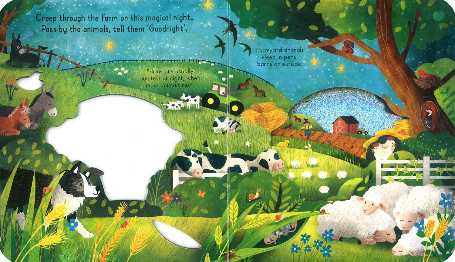 Say goodnight to the sleepy farmyard creatures! Learn about each animal as you tiptoe into barns, creep across fields and peep into stables. This beautiful book combines facts and fun, with a gentle rhyming text that's perfect for bedtime.