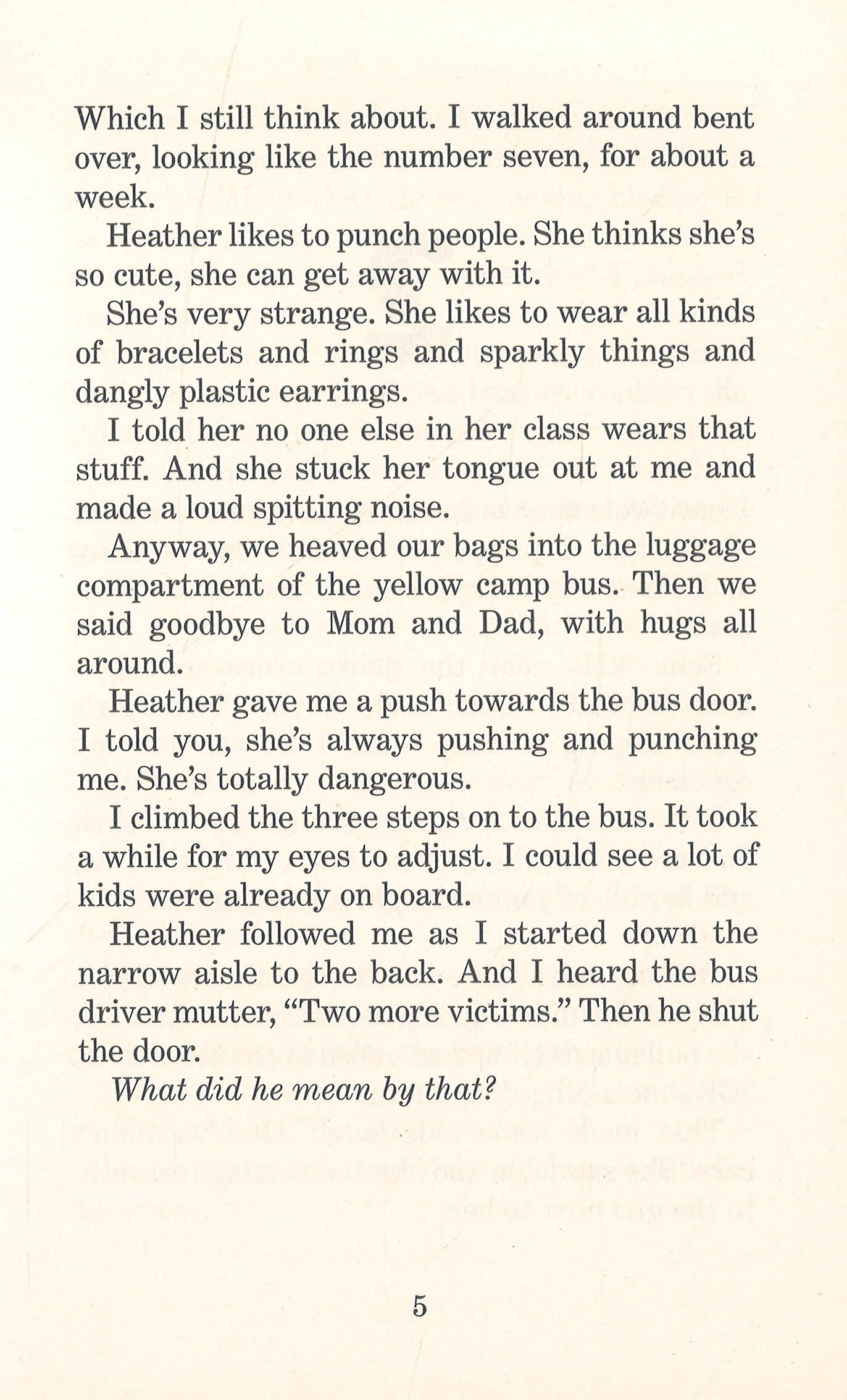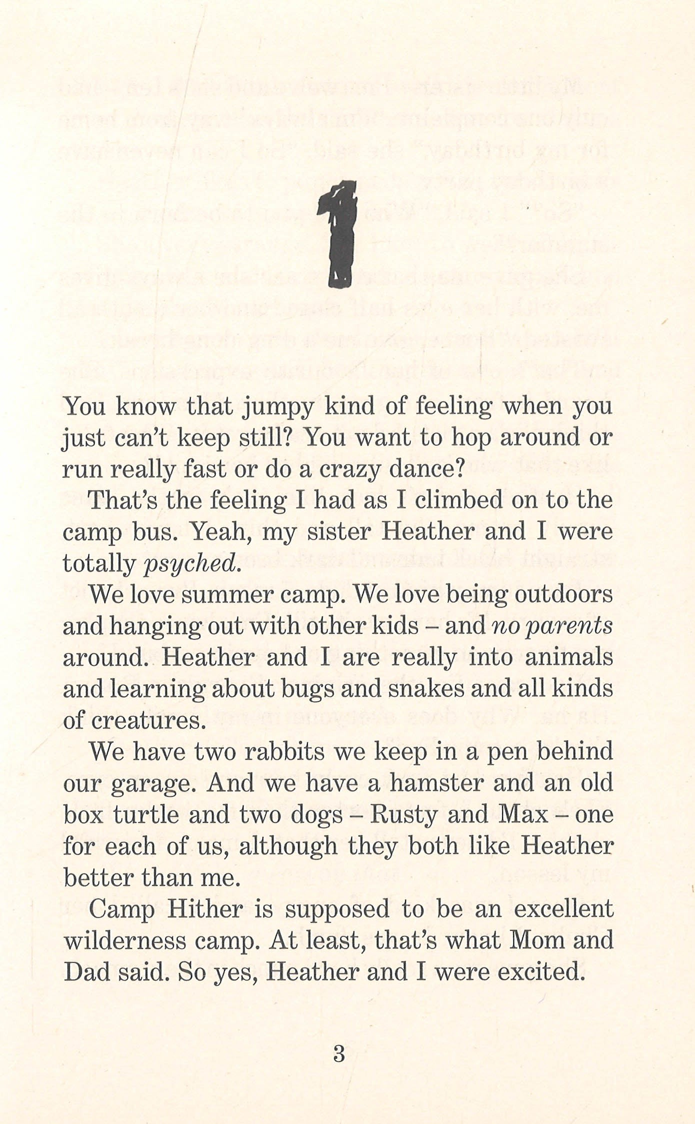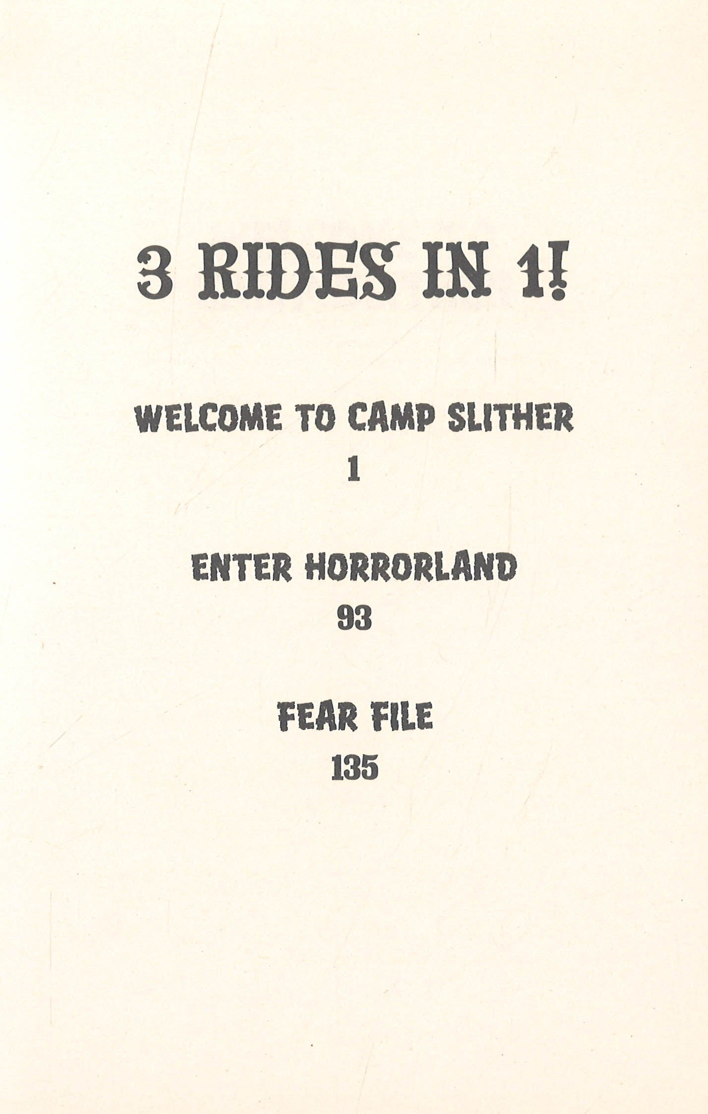 Twelve-year-old Boone and his sister Heather love animals of every kind. That's why they wanted to come to Camp Slither. The wild legends of man-eating snakes and disappearing campers are hisss-terical! But Camp Slither has a cold-blooded secret ...somebody has unleashed a hungry horde of slithery snakes! Can Boone and Heather survive long enough to accept their invitation to HorrorLand? Yesssssss! But only if they figure out why Camp Slither is crawling with trouble.