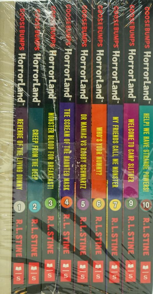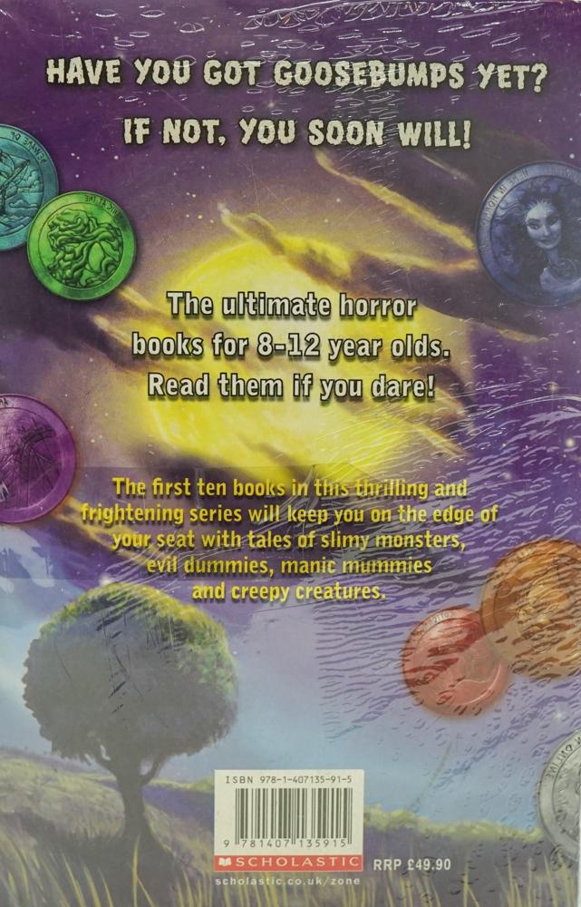 The first ten book in this thrilling and frightening series will keep you on the edge of your seat with tales of slimy monsters, evil dummies, manic mummies and creepy creatures. Titles Included: Welcome to Camp Slither Help! We Have Strange Powers! Say Cheese- and Die Screaming! My Friends Call Me Monster.Who's Your Mummy? Dry Maniac VS Robby Schwartz The Scream of the Haunted Mask. Monster Blood For Breakfast!. Creep From the Deep.Revenge of the Living Dummy
