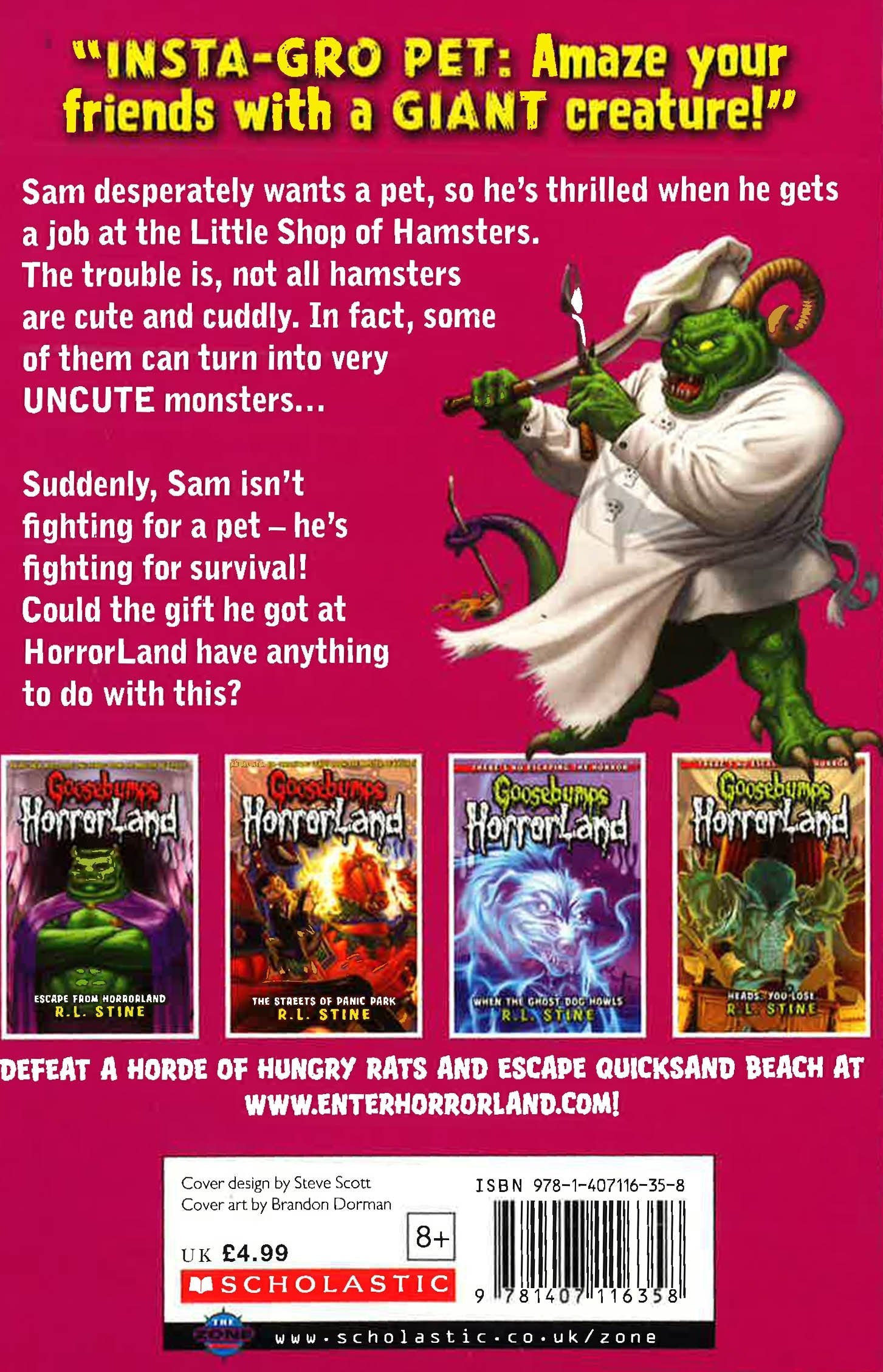 Sam Waters is desperate to have a pet. But his parents say that first, Sam must prove he's responsible. So he takes an after-school job in a pet store called Little Shop of Hamsters. To his horror, Sam soon finds that cute, little hamsters can become very UNCUTE monsters. Suddenly, Sam isn't fighting for a pet - he's fighting to survive! Could the souvenir he got in HorrorLand have anything to do with this? Each eerie adventure of the next seven-book arc begins with a trip to the Chiller House, a gift shop only found in HorrorLand. Kids are invited to take a little horror home with them and given a souvenir and a miniature Horror. At home, the kids experience wild things with their "free" gift, while the glowing, menacing Horror keeps an eye on the fun. When it's time for their payment, the Horror takes them back to shopkeeper Jonathan Chiller.